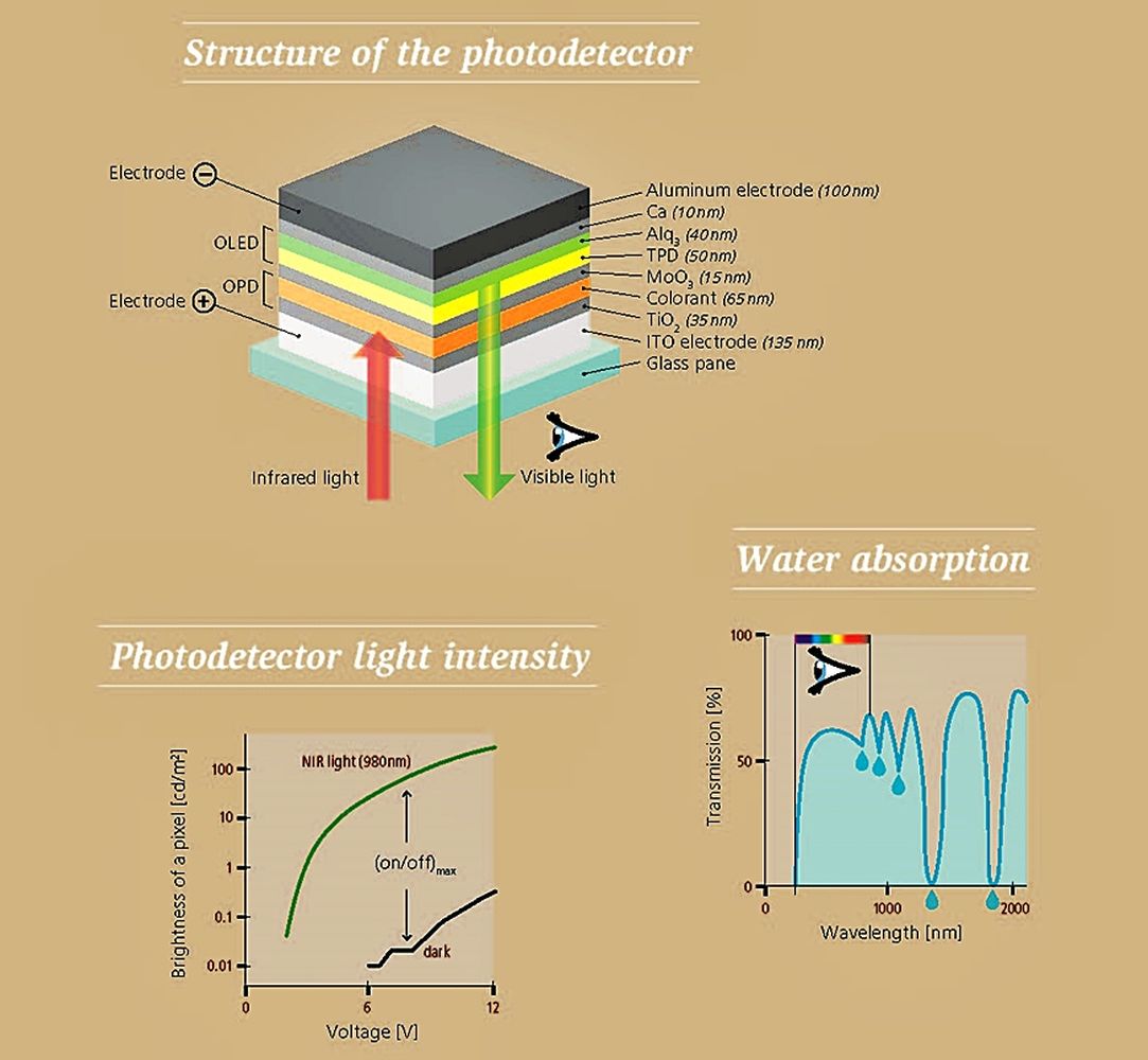 Empa researchers Roland Hany, Karen Strassel, Wei-Hsu and Michael Bauer have now succeeded in capturing SWIR light – and making it visible – with a single component. The device developed at Empa is basically an OLED display with three additional layers (see graphic). IR light falls through an electrically conductive glass pane onto a dye layer in a photodetector. Therein, electrons begin to migrate, their motion being amplified by an electrical voltage. The electrical charges then migrate into the OLED layer, where they produce a green light spot. Electronic signal processing by a computer is not necessary: The incoming (invisible) SWIR light is amplified in an "analog" way, so to speak, and displayed directly on the screen. The color of the emitted visible light – blue, green, yellow or red – can be adjusted by selecting the dye in the OLED.