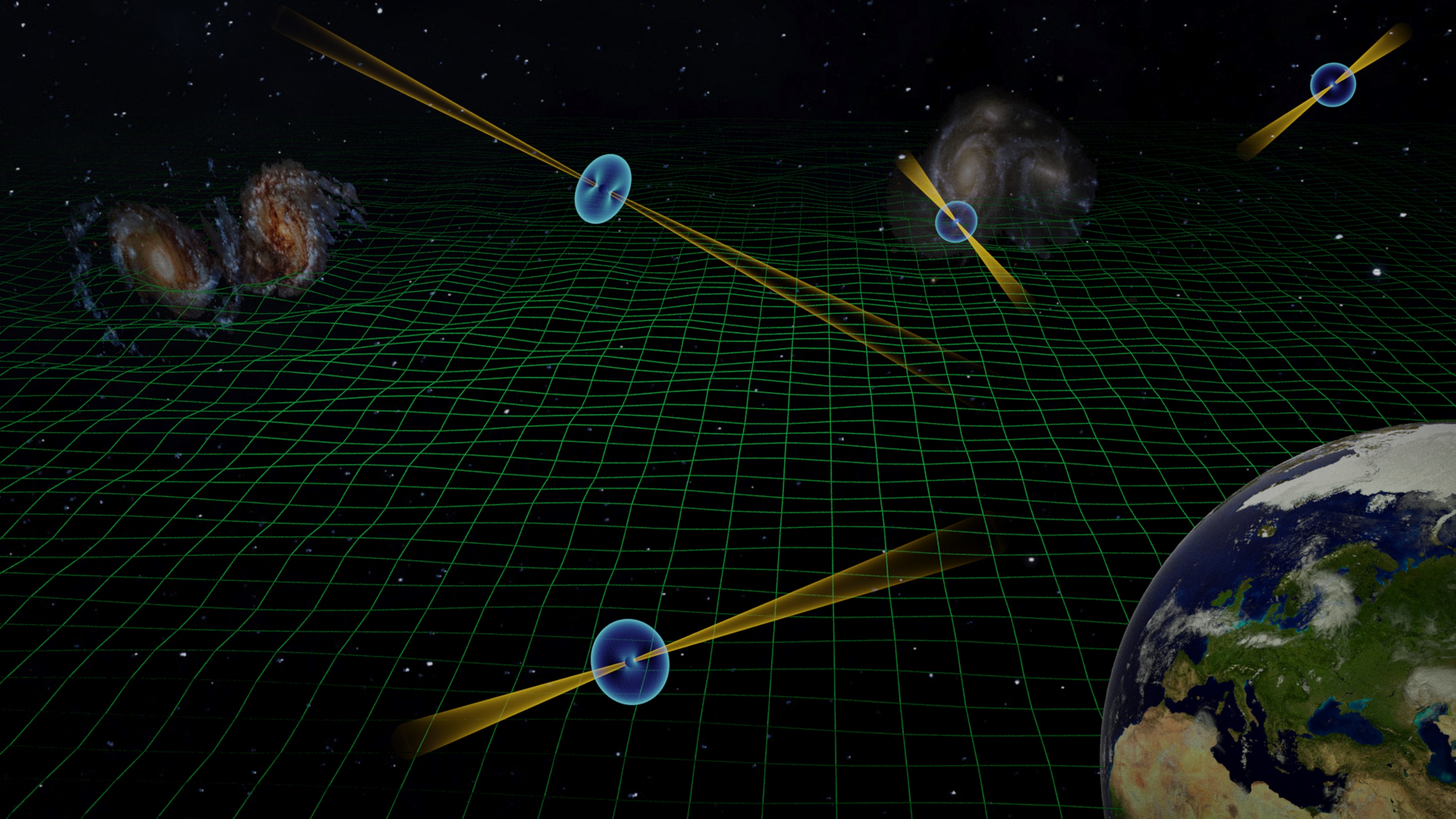 Die von den Magnetpolen der rotierenden Pulsare ausgehenden Strahlen werden als Pulse beobachtet, wenn sie die Sichtlinie zur Erde passieren, ähnlich wie beim Licht eines fernen Leuchtturms. Pulsar Timing Arrays (PTAs) sind Netzwerke von sehr stabil rotierenden Pulsaren, die als Detektoren für Gravitationswellen im galaktischen Maßstab eingesetzt werden. Sie sind insbesondere empfindlich für sehr niederfrequente Gravitationswellen im Milliardstel-Hertz- oder Nanohertz-Bereich. Dadurch wird das Beobachtungsfenster für Gravitationswellen von den hohen Frequenzen mit Hunderten von Hertz erweitert, wie es derzeit von bodengestützten Observatorien (LIGO, Virgo, KAGRA) beobachtet wird. Während deren Detektoren kurzzeitige Kollisionen von stellaren Schwarzen Löchern und Neutronensternen untersuchen, können mit den Pulsar Timing Arrays Gravitationswellen untersucht werden, wie sie von Systemen umeinander rotierender und langsam sich annähernder supermassereicher Schwarzer Löcher in den Zentren von Galaxien ausgesandt werden. Die Addition der Gravitationswellen, die von einer kosmischen Population dieser Binärsysteme freigesetzt werden, bildet den Gravitationswellenhintergrund.