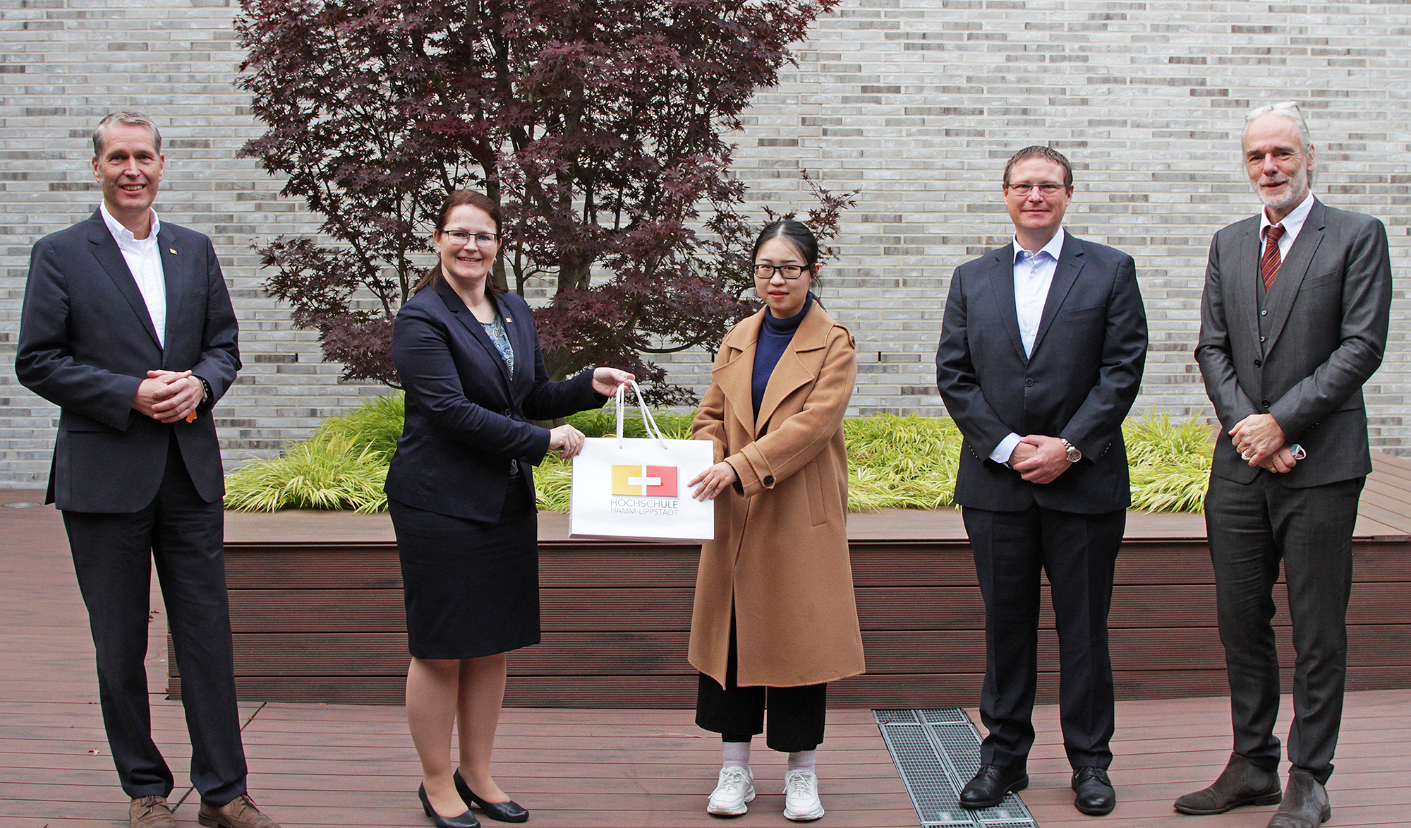 Lihui Liu ist die erste Absolventin des Double-Degree-Programms, das die Hochschule Hamm-Lippstadt (HSHL) in Kooperation mit der Chongqing University of Posts and Telecommunications durchgeführt hat. Am Montag, 25. Oktober 2021 bekam sie im Rahmen einer kleinen feierlichen Übergabe mit der HSHL-Präsidentin Prof. Dr.-Ing. Kira Kastell und dem Programmverantwortlichen HSHL-Professor Dr.-Ing. Peter Kersten ihre Bachelorurkunde überreicht.