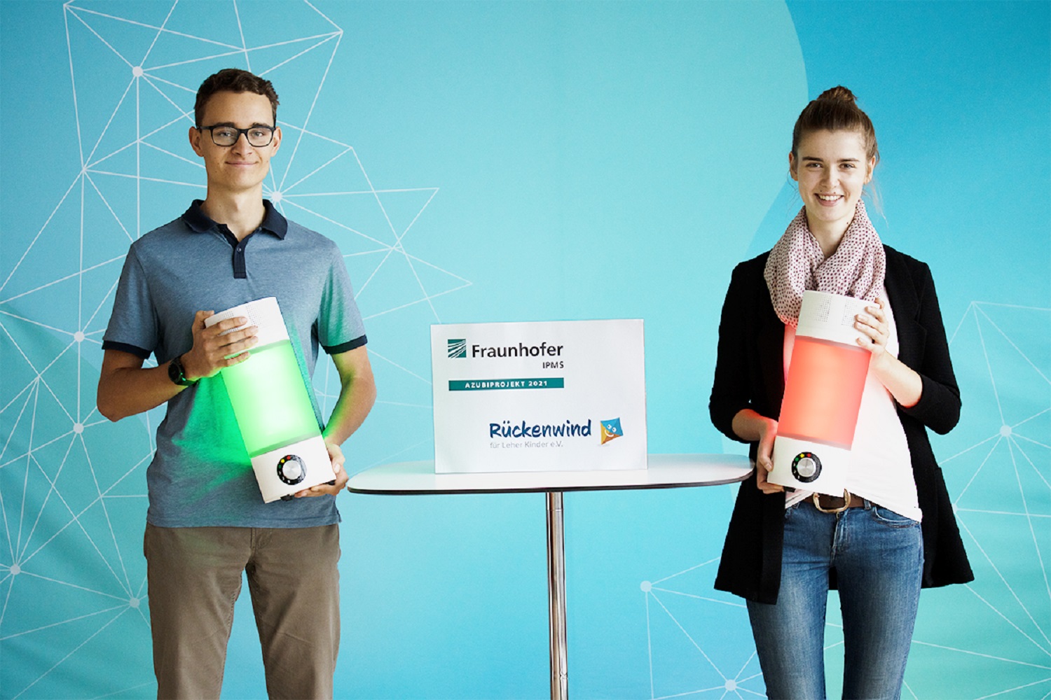 The noise-indicating lamp developed by Fraunhofer IPMS trainees uses clever technology to visually display the noise level in indoor spaces. The familiar traffic light colors green, yellow and red illustrate the current noise level in the environment. At the peak noise level there is also an acoustic signal. This means that everyone, young and old alike, can tell when it is too loud in the room. "As a native of Bremerhaven, I think the work of the Rückenwind association is great and was immediately willing to help when asked for support," says Dr. Olaf Hild, group manager at Fraunhofer IPMS in Dresden. "Therefore, with the support of our institute management, I decided to implement a trainee project. In the process, our trainees benefited from an exciting cross-departmental project for a good cause," Hild continues.