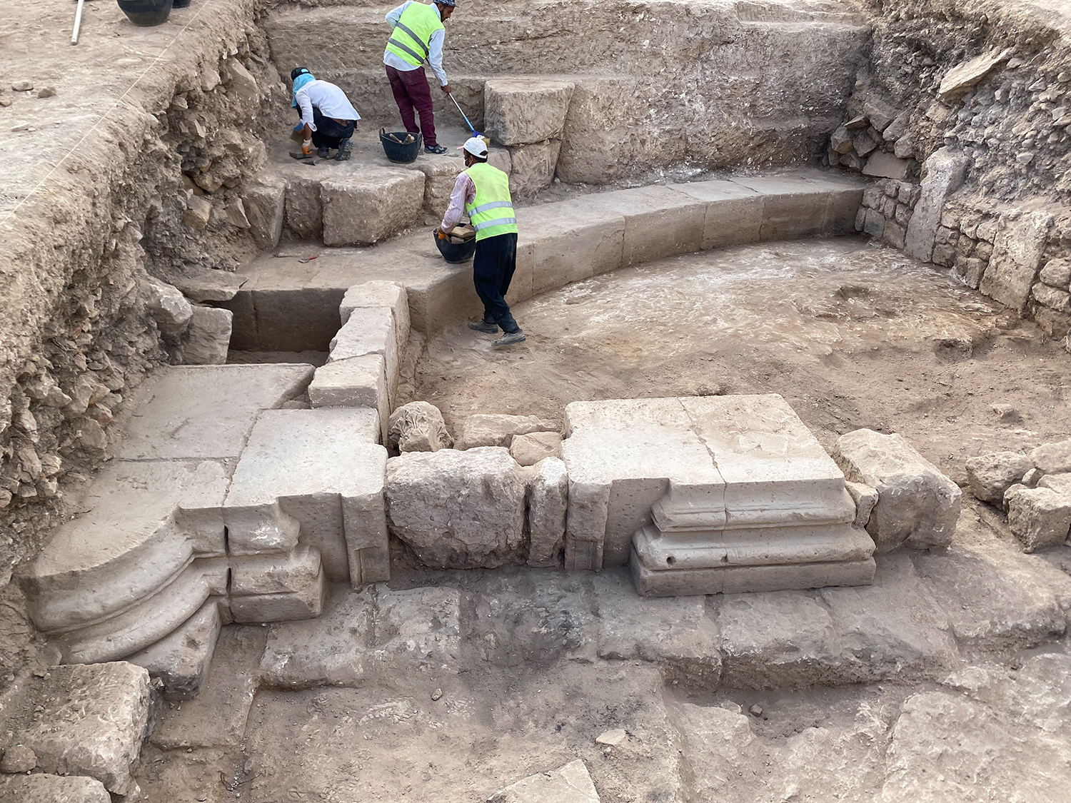 Soweit bislang erkennbar, liegt im Zentrum des Feldes ein ost-west orientierter Tempel von rund 35 Meter Breite. Sein Innenraum schließt im Westen mit einer Apsis, einem halbrunden Raum, ab, deren Breite etwa zwölf Meter beträgt. Die seitlich angrenzenden Bereiche sind noch nicht vollständig untersucht. Die Wissenschaftler gehen davon aus, dass sich jeweils kleine Seitenräume anschlossen, die von der Apsis aus zu erreichen waren. „Trotz starker Zerstörungen durch eine lange Nachnutzung und Steinraub vermitteln die freigelegten Reste des Tempels auch heute noch einen guten Eindruck von seiner Monumentalität. Zudem erlauben zahlreiche Kapitell- und Gebälkfragmente von beachtlicher Größe, den Aufbau des Gebäudes schon jetzt sehr genau zu rekonstruieren“, betont Grabungsleiter Engelbert Winter.