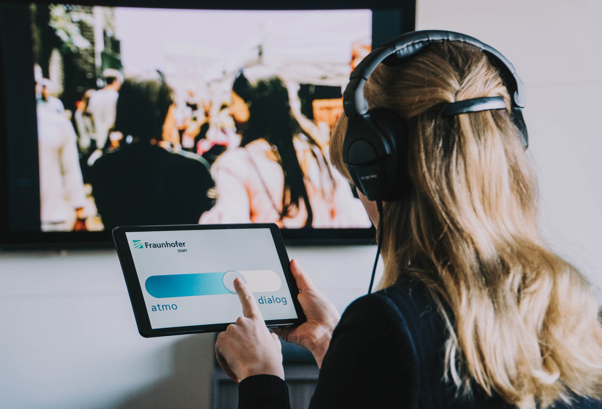 Bei einer schlechten Sprachverständlichkeit müssen Audioprofis entweder die Tonmischung überarbeiten oder die Aufnahmeverhältnisse anpassen. Hier setzt eine weitere Lösung des Fraunhofer IDMT an. Sie ermittelt notwendige Anpassungen für eine bessere Sprachverständlichkeit, gibt entsprechende Hinweise und führt die Verbesserungen bei Bedarf sogar automatisch durch. Dabei kommen eigens entwickelte Algorithmen zur Quellentrennung zum Einsatz. Dialoge werden auch bei komplexer Hintergrundakustik, wie Musik oder Soundeffekten, isoliert und hervorgehoben. Da dies bereits mit minimaler Verzögerung bei der Signalverarbeitung umsetzbar ist, können die Lösungen neben der Vorverarbeitung auch im Sendebetrieb oder in Endgeräten beim Hörenden eingesetzt werden. Dort kann eine weitere Technologie des Oldenburger Institutsteils den Hörenden einen Vorteil bieten. Die adaptive Signalverarbeitung bezieht laute Umgebungsgeräusche vor Ort ein und passt das Audiosignal entsprechend für eine optimale Verständlichkeit an, ohne dass dafür die Lautstärke erhöht werden muss.