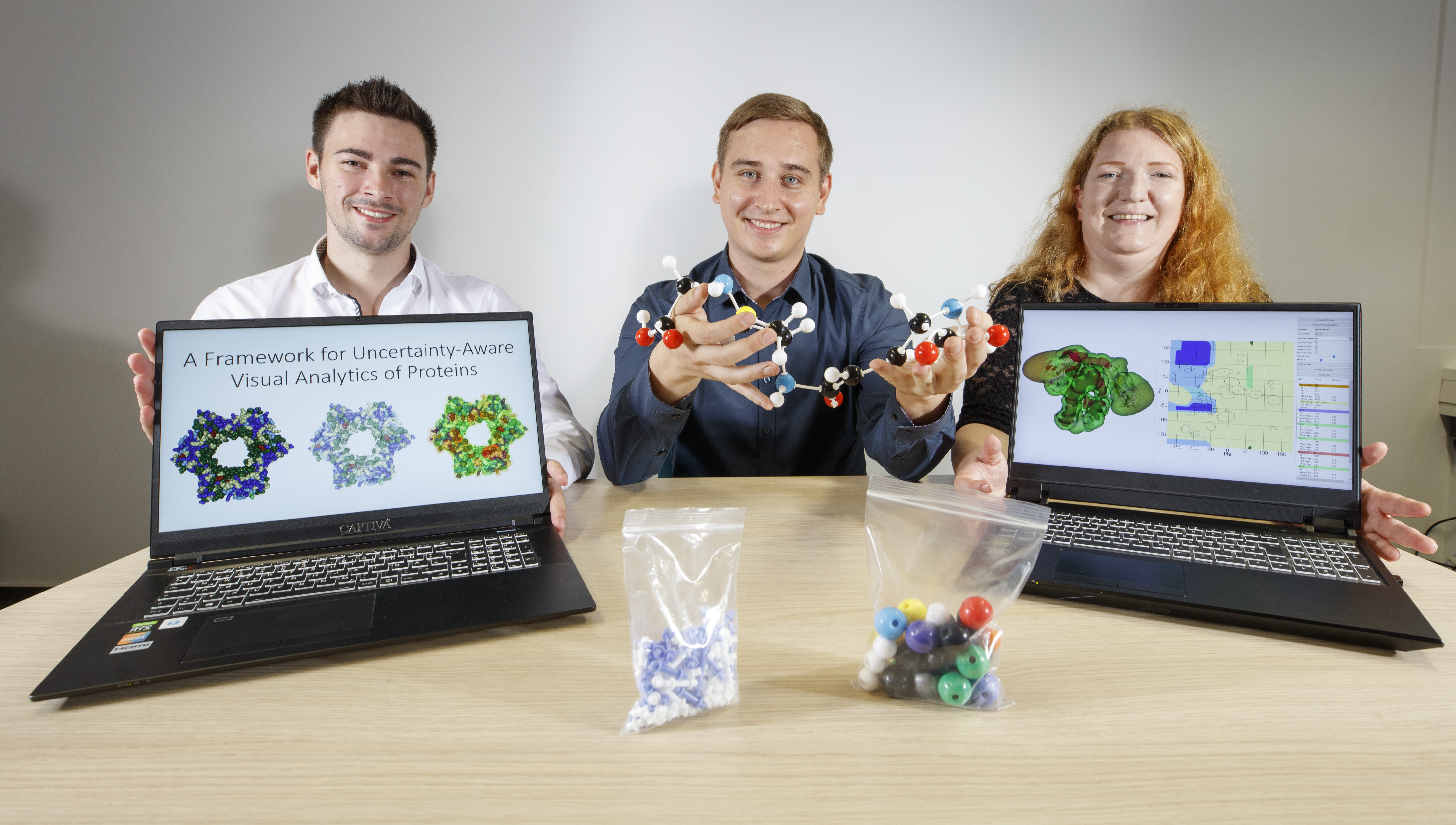 Maack arbeitet derzeit gemeinsam mit seiner Kollegin Dr. Christina Gillmann von der Universität Leipzig an einer Software, die diesen Bewegungsraum berechnet und ihn gemeinsam mit der ursprünglichen Visualisierung darstellt, ohne dass dabei vorhandene Informationen überdeckt werden. „Nutzer können mit der Software verschiedene Visualisierungsmethoden und Farbschema miteinander kombinieren“, so Maack weiter. „Sie ist übersichtlich gestaltet und ermöglicht es aber auch, dass Positionsunsicherheiten der Atome dargestellt werden.“
