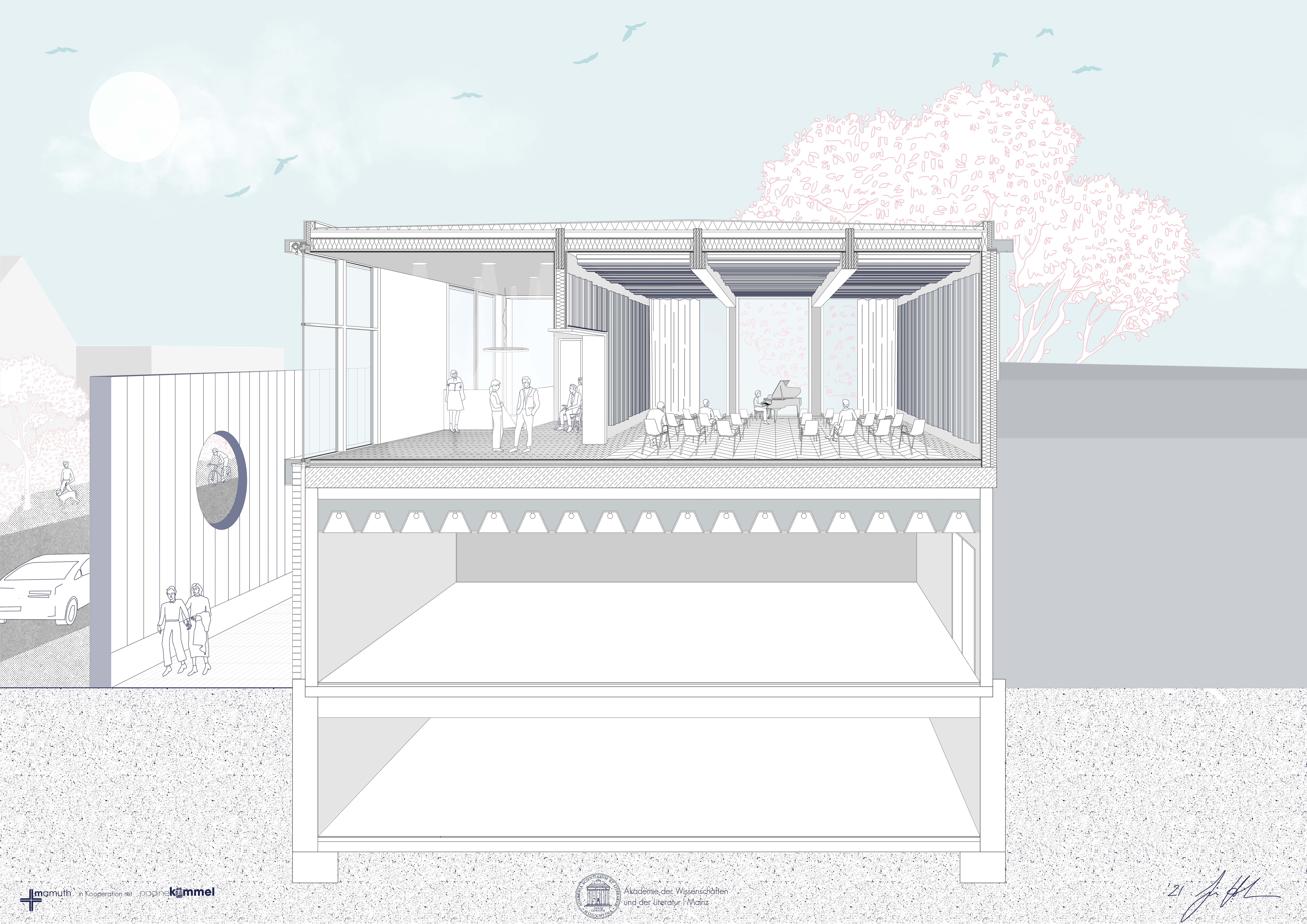 Die Akademie der Wissenschaften und der Literatur | Mainz erhält einen neuen Kammermusiksaal, der durch eine Zuwendung der Walter und Sybille-Kalkhof-Rose-Stiftung realisiert wird. Es wird der erste komplett in Holzbauweise errichtete größere Kammermusiksaal in Deutschland sein. Der 120 Quadratmeter große Saal entsteht durch die Aufstockung auf einen bestehenden Gebäudetrakt und wird künftig Platz für 80 Personen bieten. Die bauvorbereitenden Maßnahmen haben begonnen, der Baubeginn ist für Anfang 2022 geplant, die Fertigstellung ist für Herbst 2022 vorgesehen.