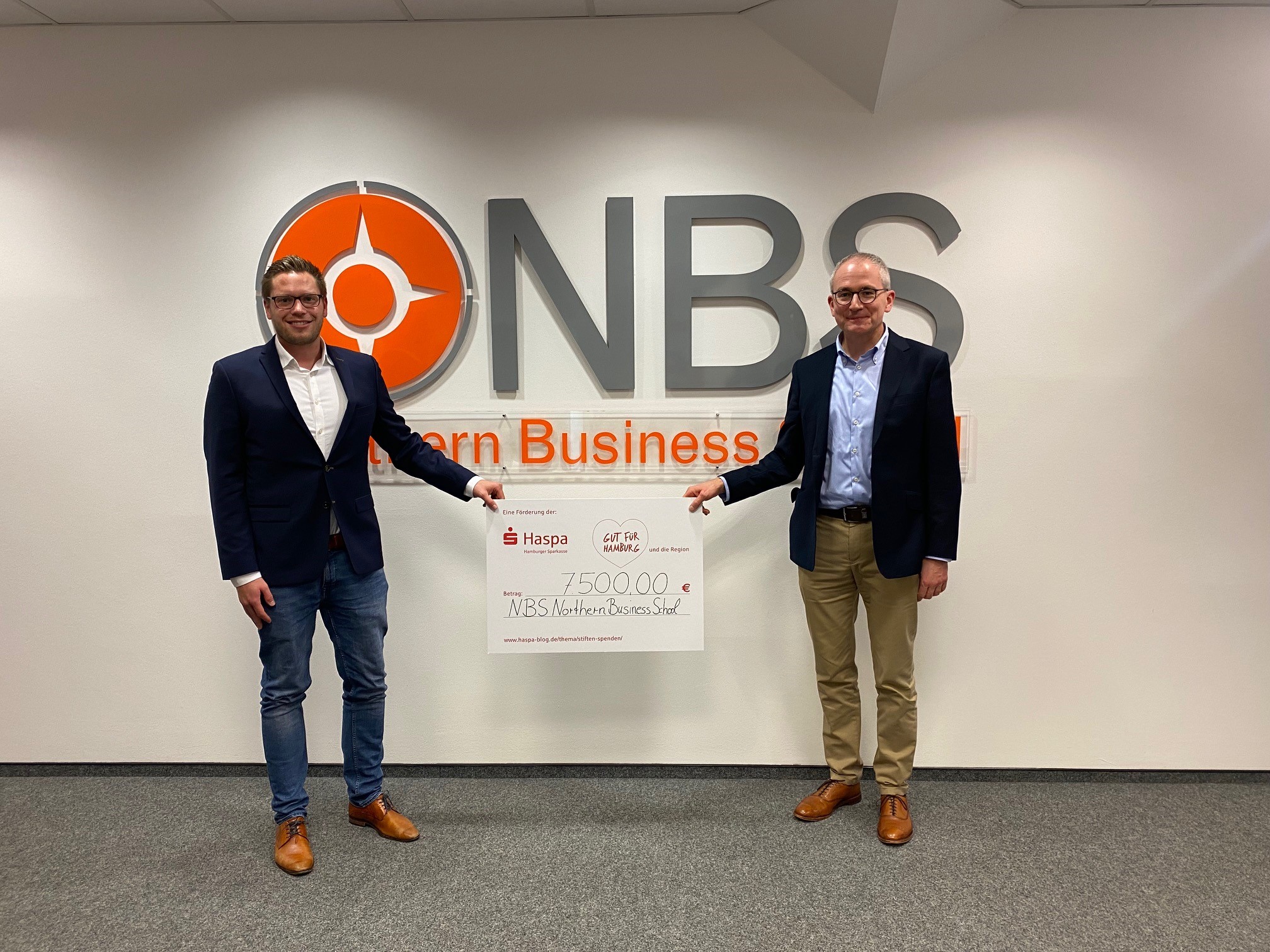 Am 03. November überreichte der Vorstand der Hamburger Sparkasse, vertreten durch Firmenkunden-Berater Helge Meyer, einen symbolischen Scheck über 7.500 Euro an Till Walther, Geschäftsführer der NBS Northern Business School gGmbH. Der Verwendungszweck: die Ausstattung der Hörsäle mit multimedialen Geräten. Die NBS Hochschule nutzt die Zuwendung für die Installation von Live-Streaming-Technik in den Sälen, um Studierenden aller Studiengänge und Zeitmodelle – auch nach der Corona-Pandemie – die Wahl zwischen Präsenz- und Online-Teilnahme zu ermöglichen. Getreu dem Motto der Hochschule "Dein Studium, das ins Leben passt."