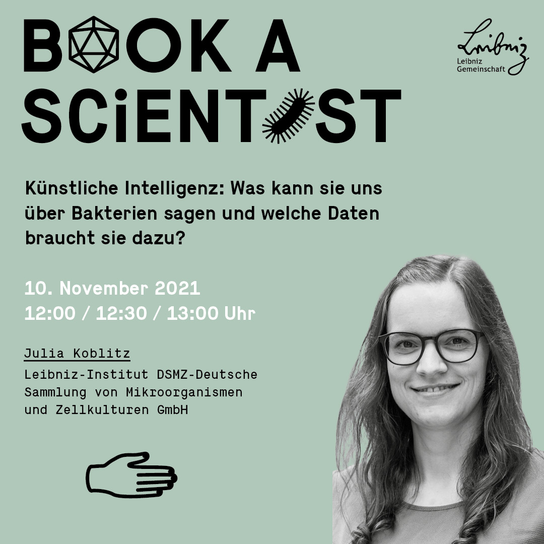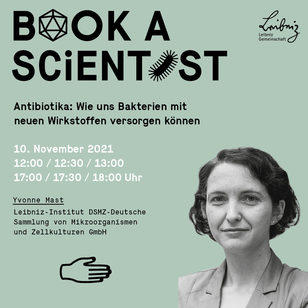 Am 10. November 2021 können Wissensdurstige 130 Forschenden der zur Leibniz-Gemeinschaft gehörenden wissenschaftlichen Einrichtungen zu unterschiedlichsten Themen befragen. Zwei Forscherinnen aus dem Kollegium des Leibniz-Instituts DSMZ-Deutsche Sammlung von Mikroorganismen und Zellkulturen GmbH in Braunschweig gehören zu den Experten, die für Speed Datings zur Verfügung stehen. Neugierige können mit Prof. Dr. Yvonne Mast ein exklusives virtuelles Gespräch über das Thema „Antibiotika: Wie uns Bakterien mit neuen Wirkstoffen versorgen können“ führen. Yvonne Mast ist Leiterin der DSMZ-Abteilung Bioressourcen für Bioökonomie und Gesundheitsforschung. Dr. Julia Koblitz von der DSMZ-Abteilung Mikrobielle Ökologie und Diversitätsforschung gibt Antworten zum Komplex „Künstliche Intelligenz: Was kann sie uns über Bakterien sagen und welche Daten braucht sie dazu?“. In persönlichen Gesprächen geben die Forschenden Einblick in ihre Themen und ihren Arbeitsalltag, beantworten Fragen und freuen sich auf den Austausch mit der wissensdurstigen Bevölkerung.