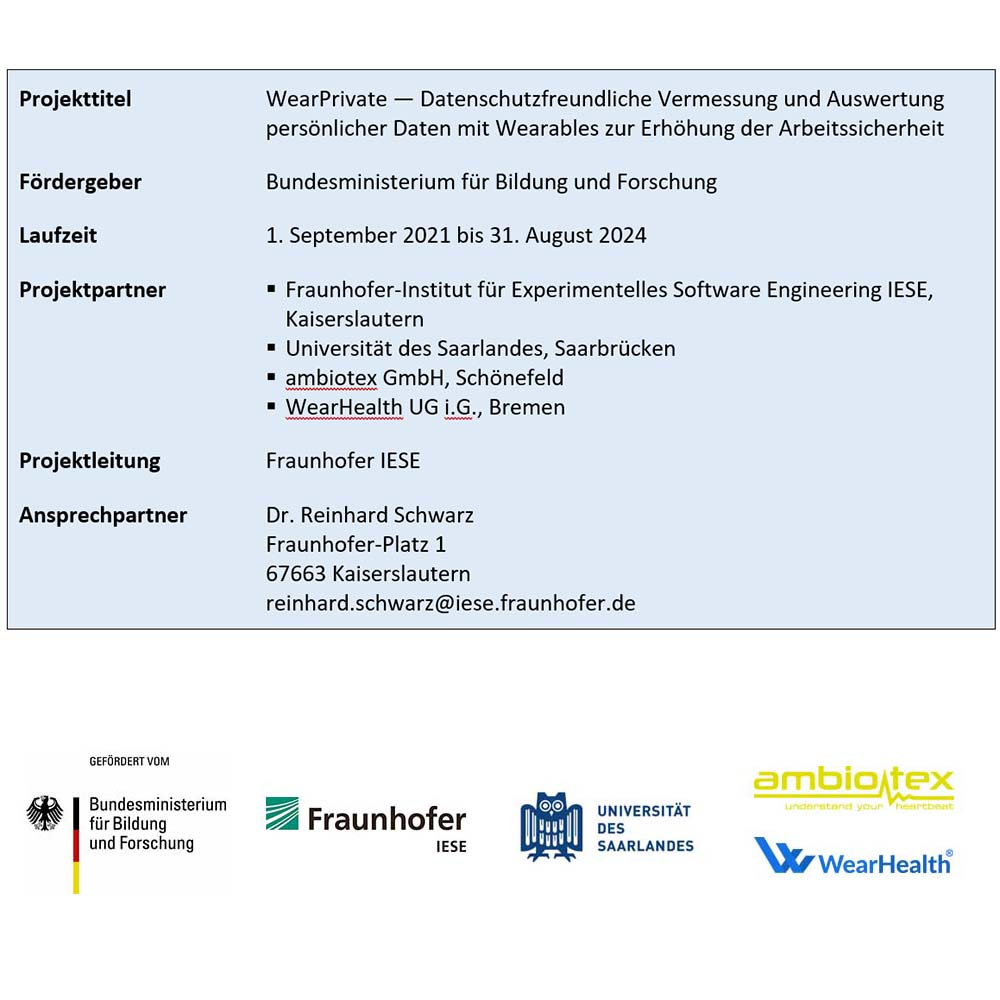Das Forschungsprojekt »WearPrivate« startete im September 2021 mit einer Laufzeit von drei Jahren. Es wird vom Bundesministerium für Bildung und Forschung gefördert. Neben dem Fraunhofer-Institut für Experimentelles Software Engineering IESE in Kaiserslautern sind an dem Projekt auch die Universität des Saarlandes sowie die Unternehmen ambiotex aus Schönefeld und WearHealth aus Bremen beteiligt.