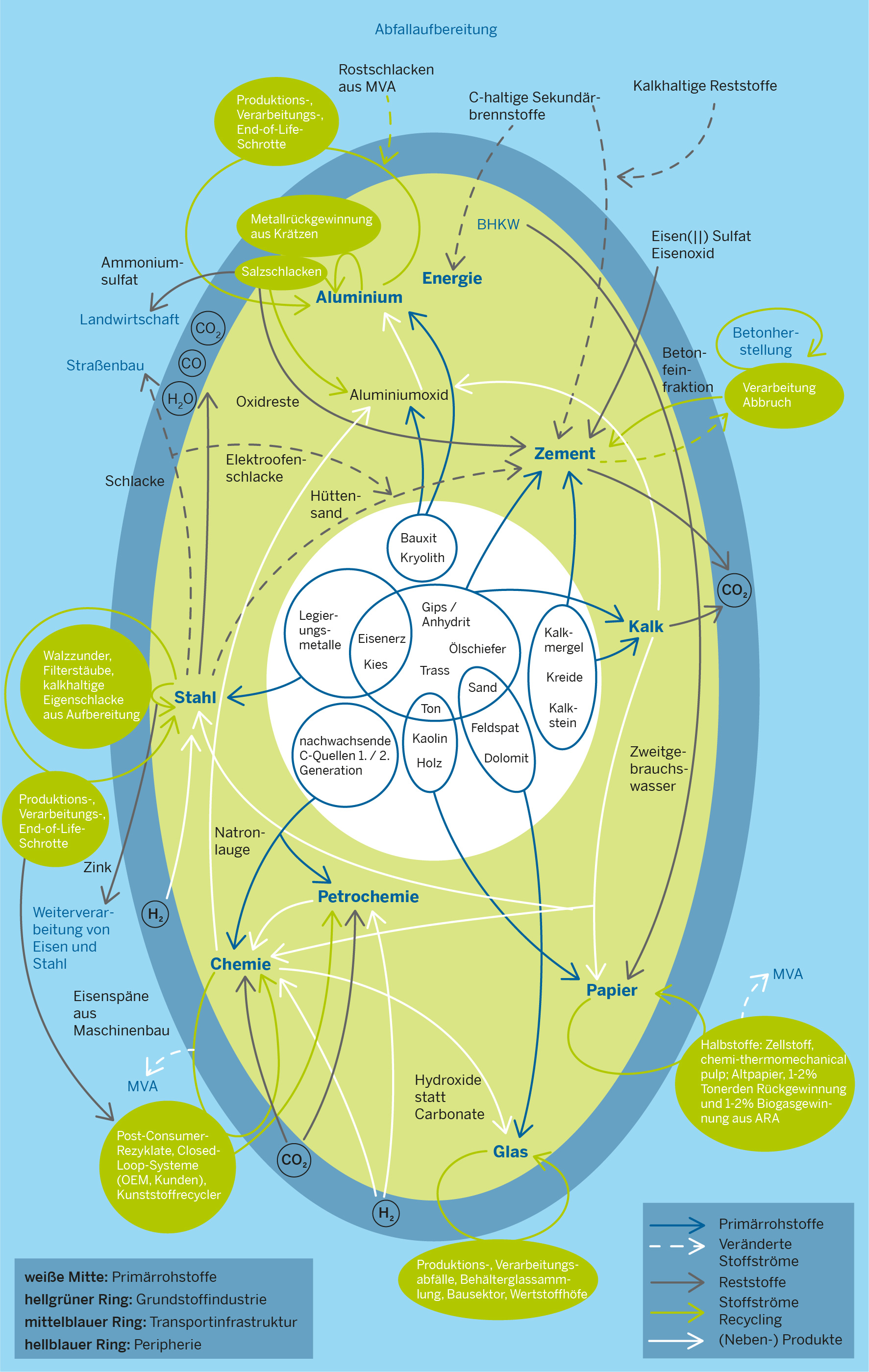 Zwar werden in der Industrie bereits heute Sekundärrohstoffe – also Reststoffe und Nebenerzeugnisse aus der Grundstoffindustrie sowie recycelte Abfälle – als Rohstoffe eingesetzt. Gerade in Industrieländern wie Nordrhein-Westfalen sind die Stoffströme vieler Industriezweige lokal eng vernetzt. Dennoch könnten ihre Nutzungspotenziale in vielen Branchen noch viel effektiver ausgeschöpft werden, um den Materialkreislauf zu schließen. Dazu bedarf es industrieller Symbiosen, also sektor- und branchenübergreifender Kooperationen, entlang der gesamten Wertschöpfungskette.