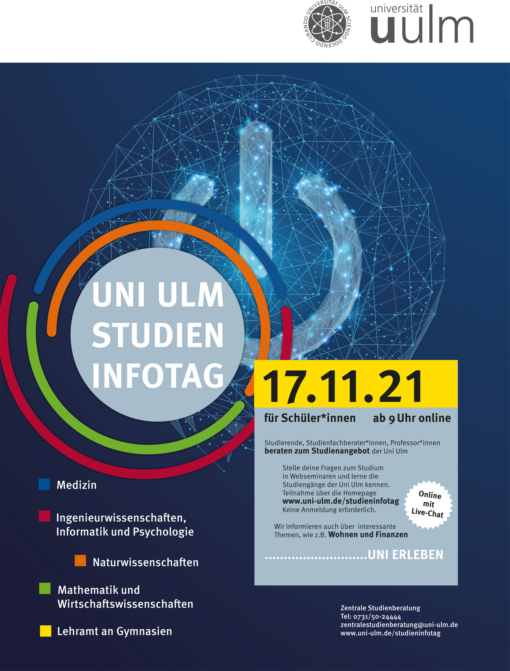 Beim virtuellen Studieninfotag am Mittwoch, 17. November (9:00 – 15:15 Uhr) können sich Schülerinnen und Schüler aus Ober- und Kursstufe über die Studiengänge der Uni Ulm informieren und Fragen rund um Studium und Beruf stellen. Eine Anmeldung zur Online-Veranstaltung auf www.uni-ulm.de/studieninfotag ist nicht erforderlich!
