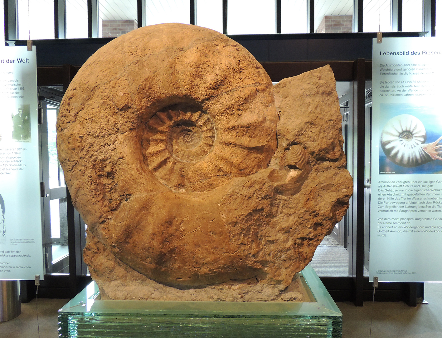 Ammoniten sind eine ausgestorbene Gruppe der Kopffüßer (Cephalopoda) und mit den heutigen Tintenfischen verwandt. Riesenformen dieser Tiere, wie auch Parapuzosia seppenradensis, bewohnten die Meere vor allem in der Kreidezeit (142-65 Mio. Jahre). Am Ende der Kreide (vor 66 Mio Jahren) starben die Ammoniten gemeinsam mit den Dinosauriern aus. Das erste Exemplar des Riesenammoniten Parapuzosia seppenradensis wurde im Jahr 1895 bei Seppenrade in Westfalen entdeckt. Er ist mit einem Durchmesser von 1,74 Metern weltweit der größte Ammonit, der bisher gefunden wurde – immer noch.