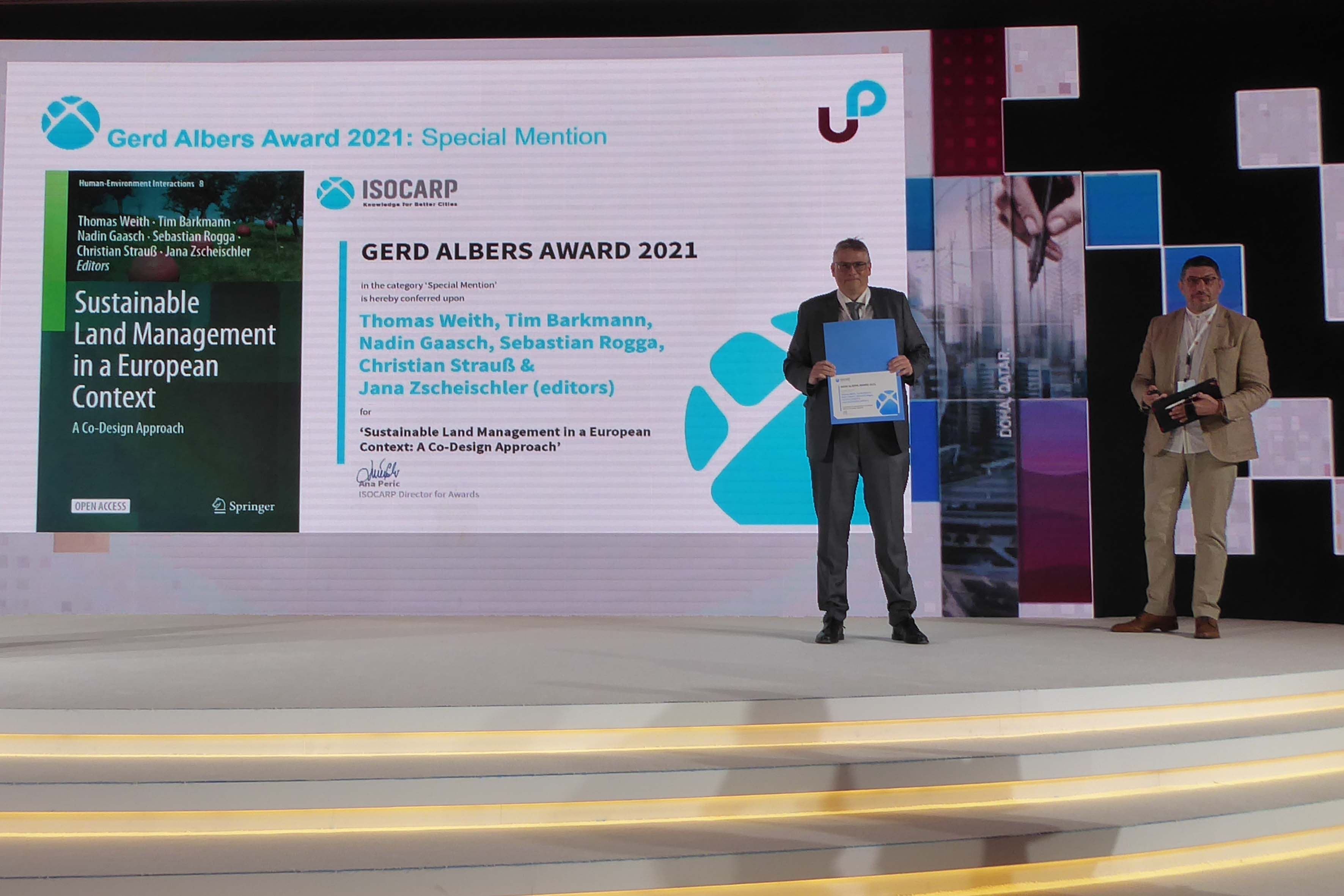 A team led by Professor Thomas Weith at the Leibniz Centre for Agricultural Landscape Research (ZALF) received the Gerd Albers Award (Special Mention) on 10 November 2021 for the publication "Sustainable Land Management in a European Context". The prize is awarded by the International Society of City and Regional Planners (ISOCARP).