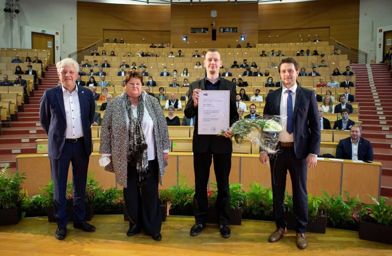 Die mit 1,0 bewertete Arbeit von Robert Wegner entstand am von Prof. Stephan Husung geleiteten Fachgebiet Produkt- und Systementwicklung unter der Betreuung von Dr.-Ing. Torsten Brix und in enger Zusammenarbeit mit der Firma HELLER Maschinen & Technologie AG in Arnstadt, die sich auf innovative Sondermaschinen insbesondere für die Automotive-Industrie spezialisiert hat. Hier hatte der gebürtige Berliner bereits von 2016 bis 2018 als Werkstudent gearbeitet und nach seinem Bachelor-Abschluss 2018, parallel zu seinem Masterstudium eine Tätigkeit als Produktingenieur aufgenommen. Der Preis wurde Robert Wegner im Rahmen der Absolventenfeier der Fakultät für Maschinenbau am 13. November 2021 durch Olaf Mollenhauer, selbst Absolvent der TU Ilmenau, Vorsitzender des Regionalausschusses Ilm-Kreis der IHK Südthüringen und erfahrener Unternehmer und Geschäftsführer der Kompass GmbH, überreicht, der ihm für seine Leistung höchsten Respekt zollte.