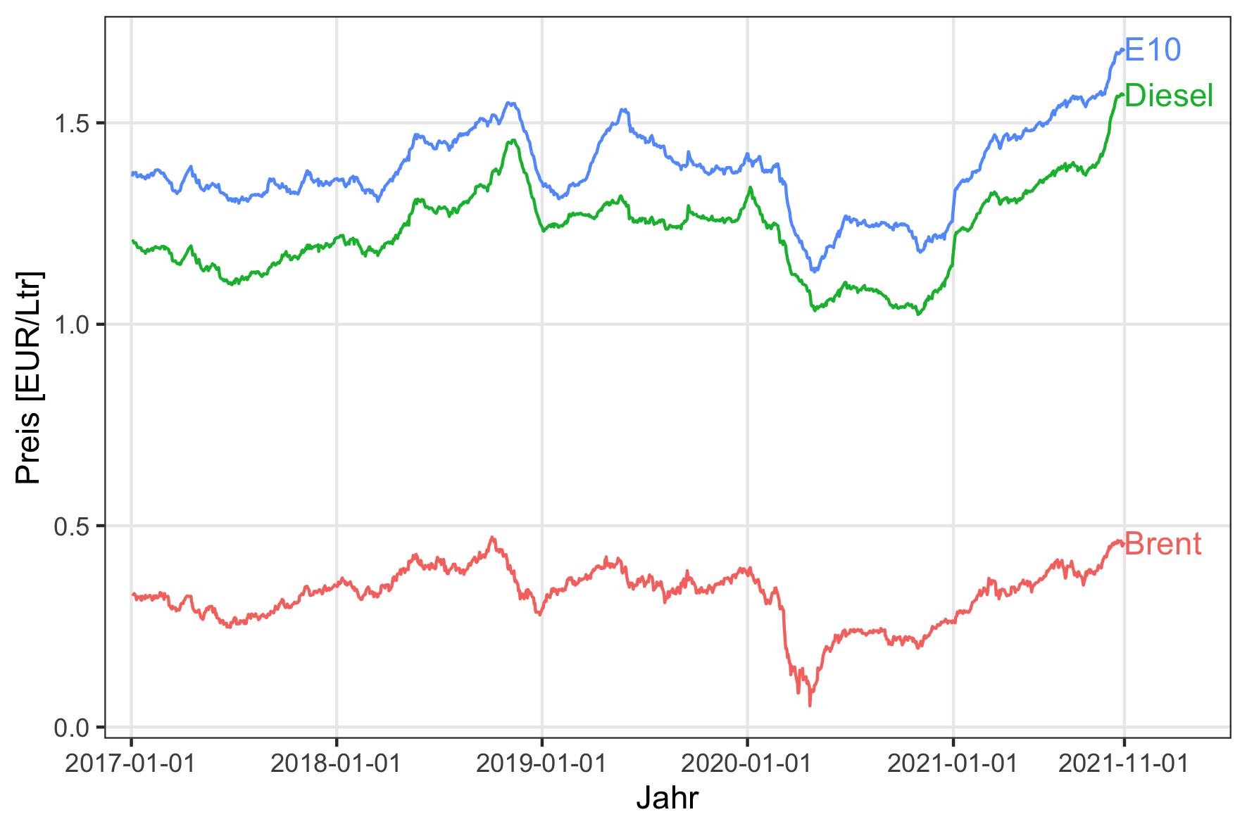- Die Gründe für die derzeit hohen Preise liegen neben den hohen Rohölpreisen auch in einem schwächeren Euro sowie zu einem geringen Teil auch in der 2021 eingeführten CO2-Bepreisung fossiler Brenn- und Kraftstoffe, die Benzin und Diesel um rund sieben bzw. acht Cent je Liter verteuerte.