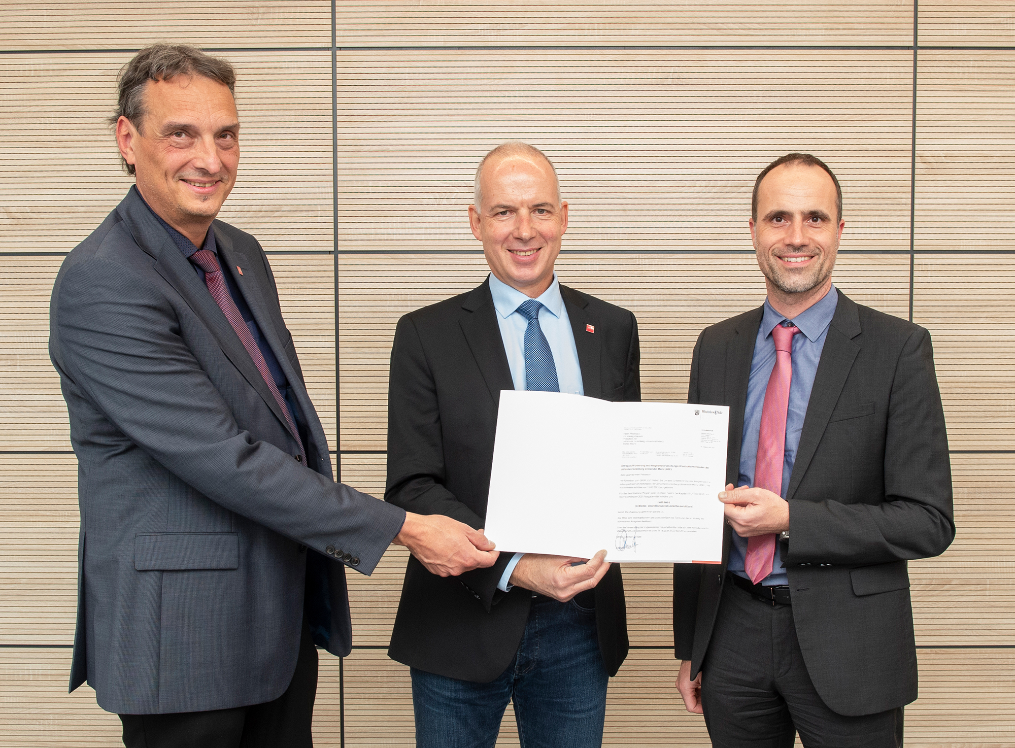 Minister of Science Clemens Hoch (r.) handing over the state grant funding approval for the implementation of the Integrated Core Facility Concept (IRIC) to JGU President Professor Georg Krausch (center) und Vice President Professor Stefan Müller-Stach