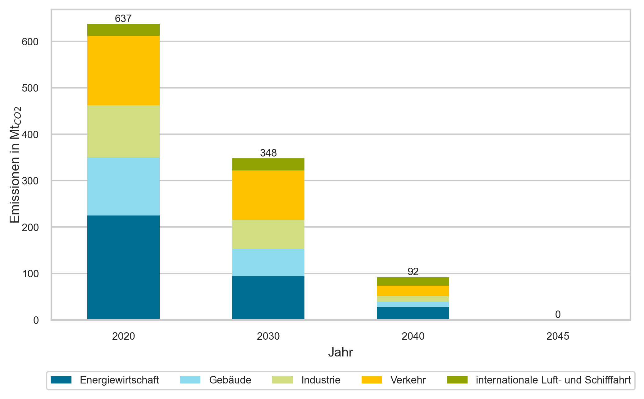 Für die neue Studie wurden die verschärften Zwischenziele des KSGs von -65 Prozent 2030 und -88 Prozent 2040 sowie das Ziel der Treibhausgasneutralität energiebedingter CO2-Emissionen 2045 als Randbedingungen in REMod umgesetzt.