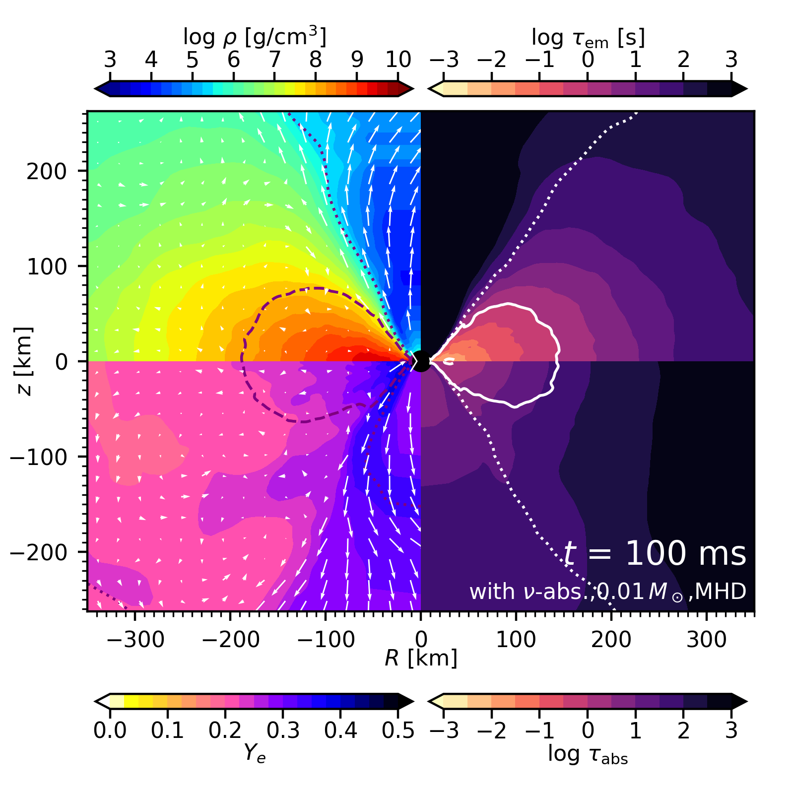 “In our study, we systematically investigated for the first time the conversion rates of neutrons and protons for a large number of disk configurations by means of elaborate computer simulations, and we found that the disks are very rich in neutrons as long as certain conditions are met,” explains Dr. Oliver Just from the Relativistic Astrophysics group of GSI's research division Theory. “The decisive factor is the total mass of the disk. The more massive the disk, the more often neutrons are formed from protons through capture of electrons under emission of neutrinos, and are available for the synthesis of heavy elements by means of the r-process. However, if the mass of the disk is too high, the inverse reaction plays an increased role so that more neutrinos are recaptured by neutrons before they leave the disk. These neutrons are then converted back to protons, which hinders the r-process.” As the study shows, the optimal disk mass for prolific production of heavy elements is about 0.01 to 0.1 solar masses. The result provides strong evidence that neutron star mergers producing accretion disks with these exact masses could be the point of origin for a large fraction of the heavy elements. However, whether and how frequently such accretion disks occur in collapsar systems is currently unclear.
