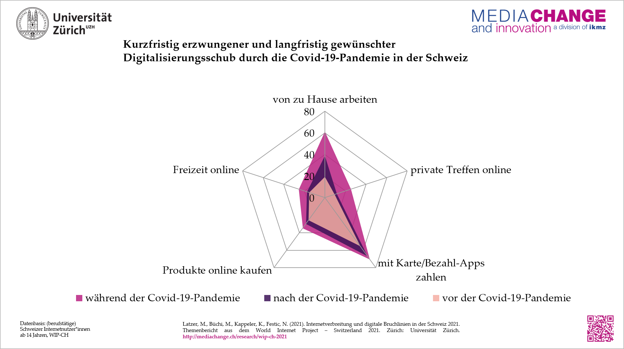 «Zwischen dem durch Covid-19 kurzfristig erzwungenen Digitalisierungsschub und dem langfristig erwünschten gibt es deutliche Unterschiede», betont Michael Latzer, Professor für Medienwandel & Innovation an der Universität Zürich. «Viele Internetnutzer hierzulande haben während der Pandemie die Vorteile von Homeoffice und bargeldlosem Bezahlen für sich entdeckt. Gerade bei zwischenmenschlichen Kontakten zeigen sich aber auch die Grenzen digitaler Alternativen». So erhöhte sich der digitale Anteil an privaten Treffen pandemiebedingt von 9 auf 25 Prozent, langfristig erwünscht sollen es 12 Prozent sein.