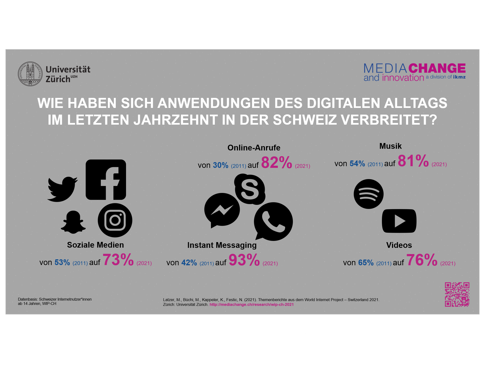 Das WIP-CH-Projekt wird von der Abteilung Medienwandel & Innovation des Instituts für Kommunikationswissenschaft und Medienforschung (IKMZ) der Universität Zürich unter der Leitung von Michael Latzer seit 2011 durchgeführt. Die diesjährigen Ergebnisse basieren auf einer repräsentativen telefonischen Befragung von 1’120 Personen ab 14 Jahren, die im Mai/Juni 2021 von DemoSCOPE durchgeführt wurde. Mitglieder des Projektteams 2021 sind Moritz Büchi, Kiran Kappeler und Noemi Festic.