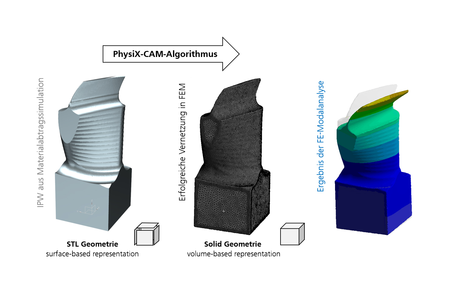 Eine Schwäche der Multi-Dexel-Modellierung ist jedoch, dass sich mit ihr nur Oberflächen- und keine kompletten Volumenkörper modellieren lassen. Für Finite- Elemente-Simulationen zur Vorhersage des Werkstück-Schwingungsverhaltens brauchte das Aachener Team aber ein solches Volumenkörpermodell. Die Forscherinnen und Forscher erweiterten deshalb mit viel Aufwand die Multi-Dexel-Modellierung und programmierten zahlreiche neue Funktionalitäten.