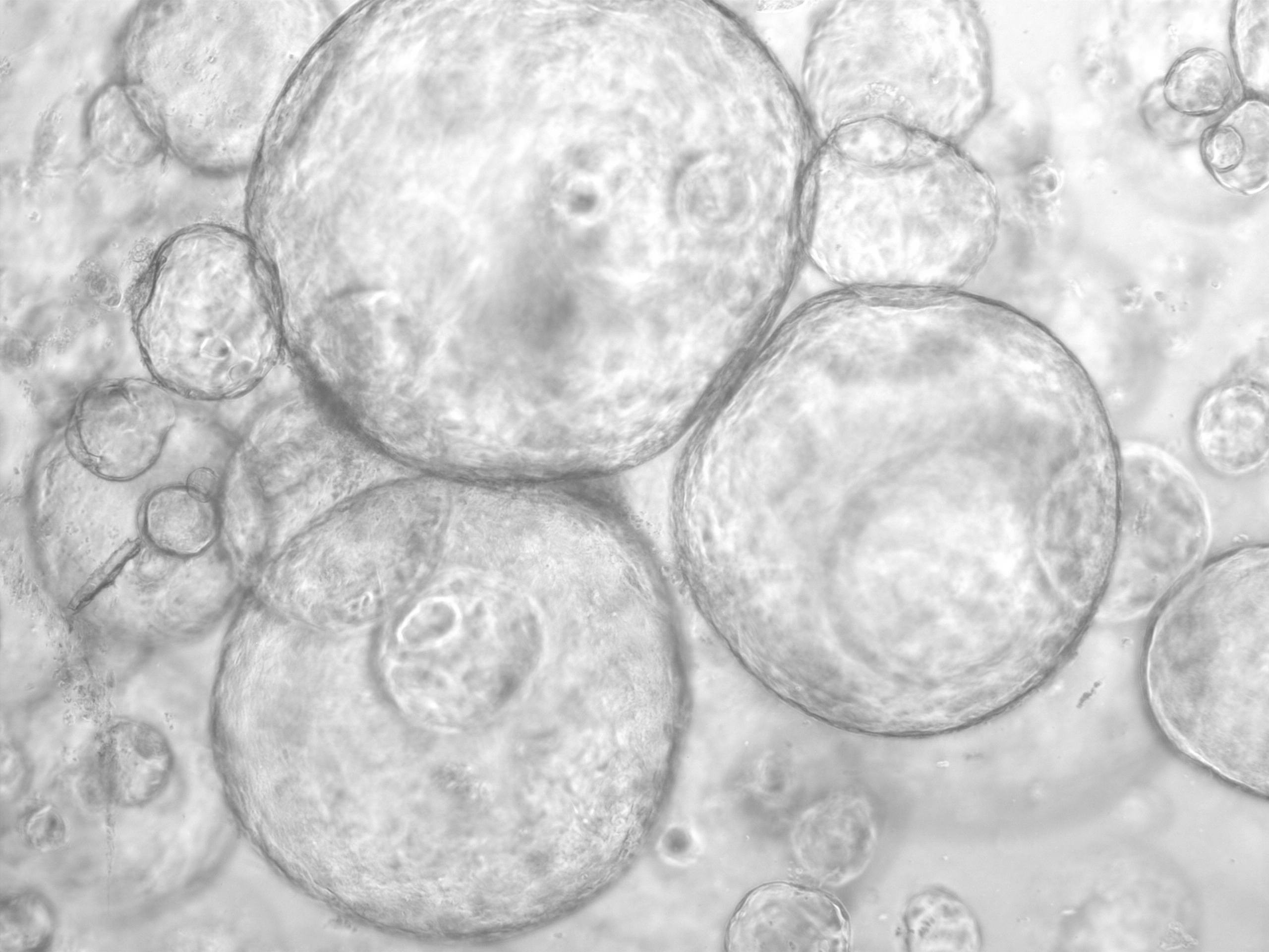 Die Mikroskop-Aufnahme zeigt sogenannte Organoide. Das sind Zellen, die in einer Matrix eine beerenförmige Struktur ausbilden, typischerweise mit einem Hohlraum in der Mitte sowie inneren und äußeren Zellen. Organoide werden für das Projekt aus Gewebeproben von Patient:innen gezüchtet. Auf diese Weise können zum Beispiel Wirkstoff-Wirkungen und die Entstehung von Tumoren untersucht werden.