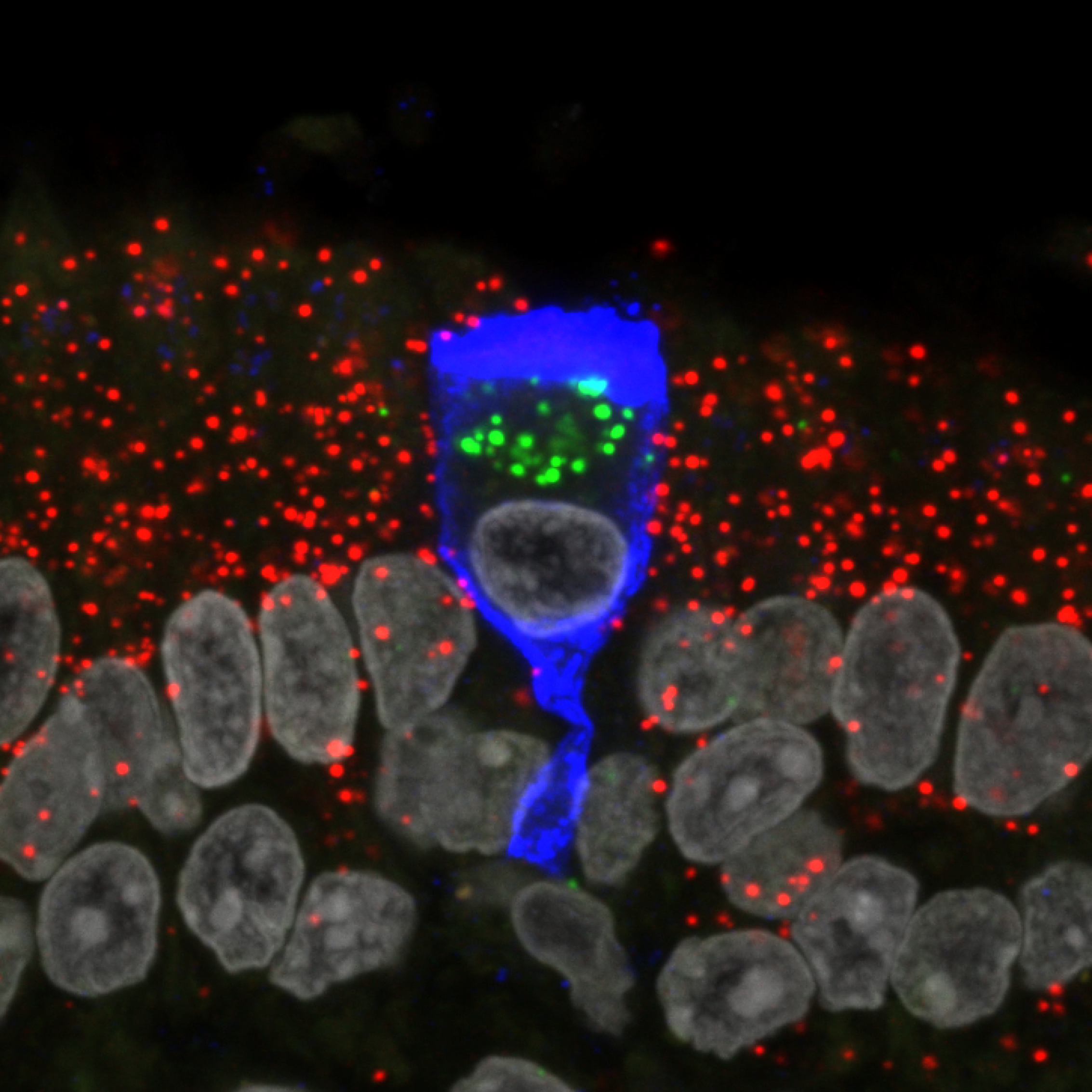 Damit Sars-CoV-2 eine Zelle befallen kann, muss das Virus an einen Rezeptor auf der Zellmembran binden. Der klassische Eintrittsrezeptor ist ACE2. Frühere Studien haben gezeigt, dass ACE2 von Stützzellen im menschlichen Riechepithel gebildet wird, nicht aber von den Riechsinneszellen – also den Nervenzellen, die durch Geruchsstoffe in der eingeatmeten Luft stimuliert werden und elektrische Signale an den Riechkolben im Gehirn weiterleiten.