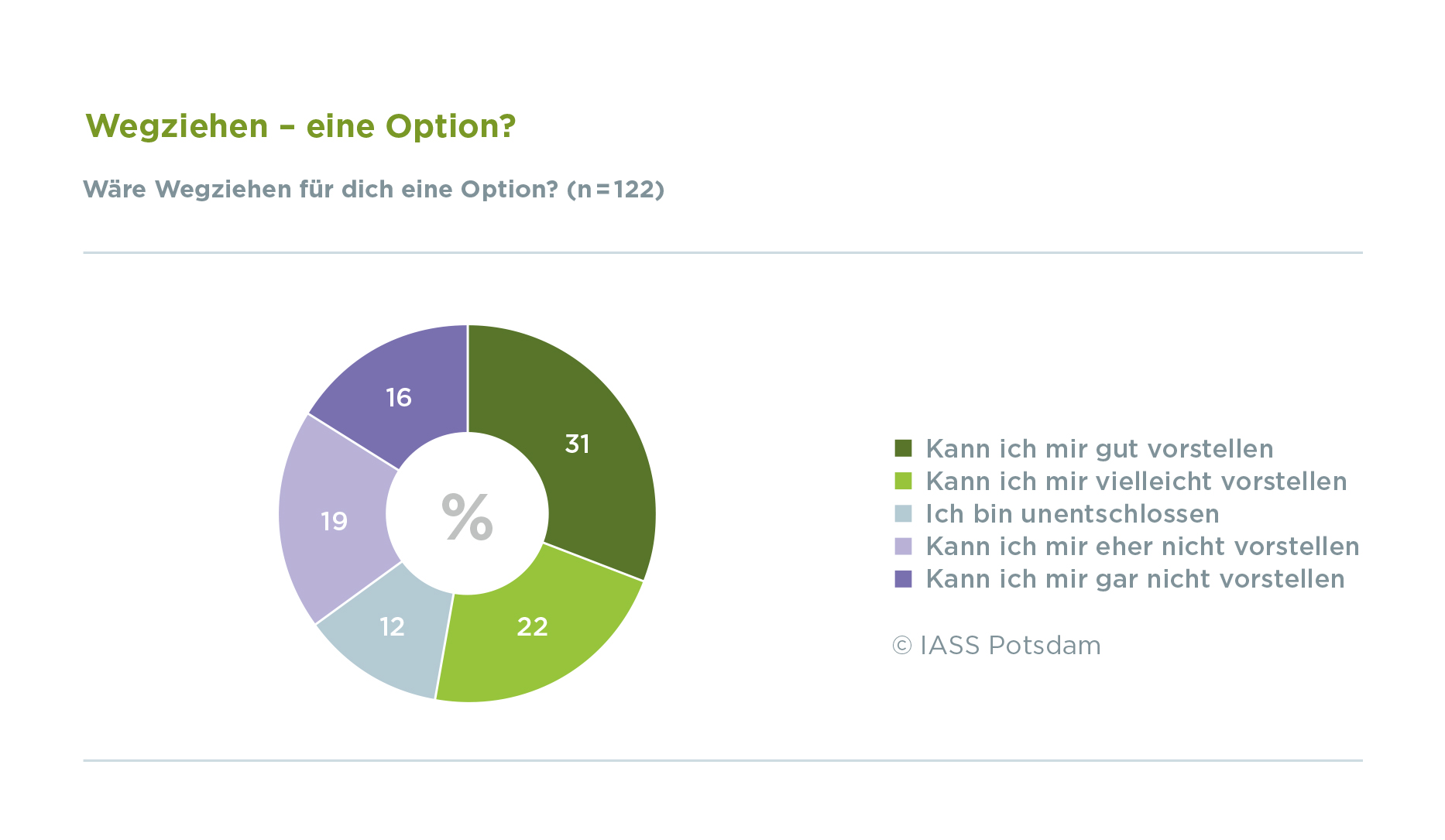 Das soziale Umfeld ist für die Auszubildenden ein ebenso wichtiger Bleibefaktor wie die Verfügbarkeit von guten Arbeitsplätzen. 41 Prozent signalisieren, dass für sie Möglichkeiten politischer Beteiligung wichtig wären, um in der Region zu bleiben. Falls wichtige Bleibefaktoren und Bedürfnisse nicht politisch adressiert werden, kann sich die Hälfte der Auszubildenden auch vorstellen, die Region zu verlassen.