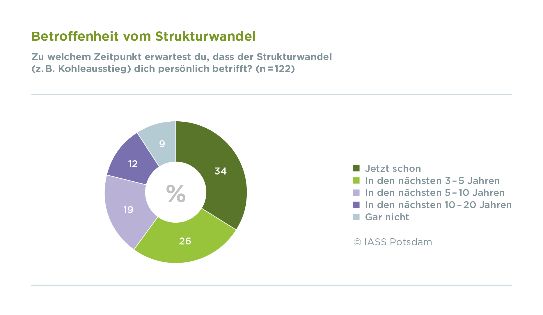 Die Mehrheit der Auszubildenden fühlt sich vom Strukturwandel betroffen. Sie sind grundsätzlich zufrieden mit ihrem Alltagsleben, insbesondere mit ihrem sozialen Umfeld. Unzufriedenheit lösen unter anderem fehlende Möglichkeiten für junge Menschen politisch mitzumachen sowie eine Unklarheit hinsichtlich zukünftiger Beschäftigungsfelder aus. Im Hinblick auf die Verfügbarkeit von guten Arbeits- und Ausbildungsplätzen und die Stabilität ihres sozialen Umfeldes blicken sie skeptisch auf den Strukturwandelprozess, in anderen Bereichen rechnen sie nicht mit großen oder im Falle von Weiterbildungsgelegenheiten sogar teils mit positiven Veränderungen. Einer der wichtigsten Stabilitätsanker ist für sie Engagement und Vereinsleben in der Region.