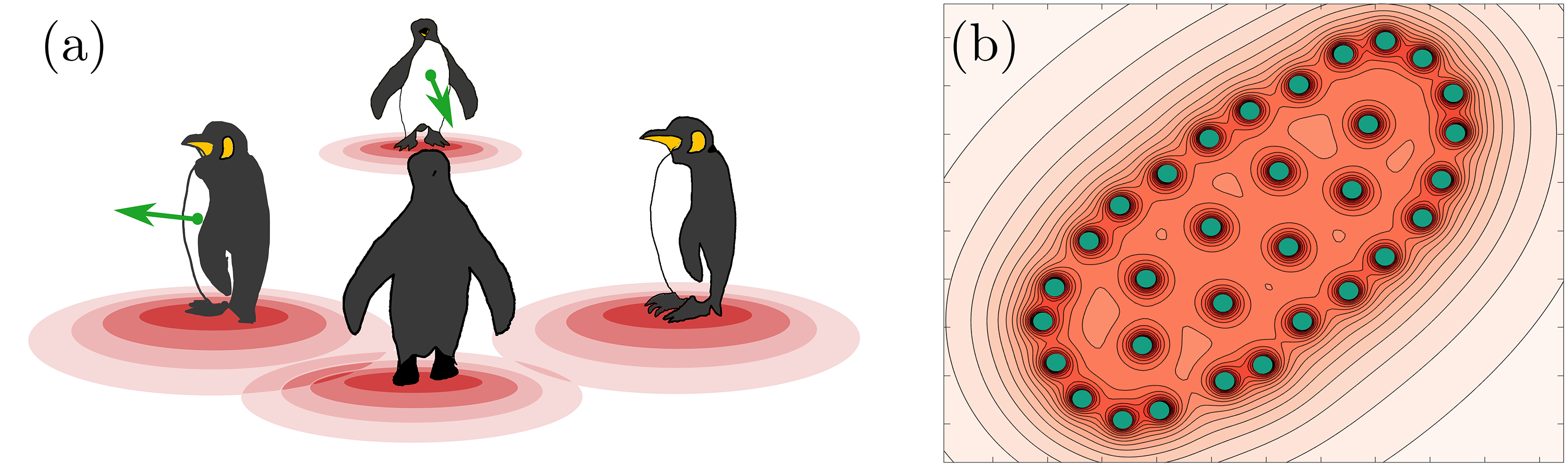 Beispiel für kollektive Selbstoptimierung (a): Schema der sozialen Thermoregulation bei Kaiserpinguinen, die als Wärmequellen wirken (rot) und sich zugleich hin zu ihrer Wohlfühltemperatur bewegen (grüne Pfeile). (b) Draufsicht der Gleichgewichtskonfiguration von 32 Pinguinen (grüne Scheiben) nahe dem kollektiven Optimum. Die schwarzen Linien sind Isothermen und dunkle Rottöne repräsentieren hohe Temperaturen. (Abbildung: HHU / Alexandra V. Zampetaki)