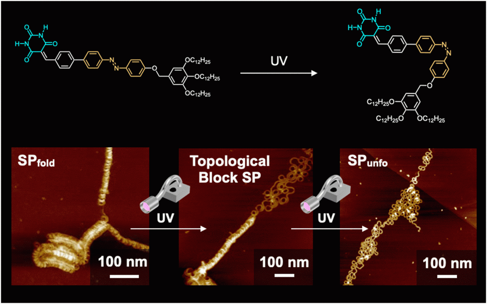 Die Wissenschaftler:innen bauten das supramolekulare Polymer aus stäbchenartigen Molekülen auf, die sich zu sechsgliedrigen Rosetten zusammenlagerten. Die Rosetten stapelten sich zu einer unendlich langen Kette aufeinander, das supramolekulare Polymer. Eine zusätzliche Krümmung entlang des Rosettenstapels ließ die Nanofaser zu einer langen, wendelförmigen Struktur verdrillen, einer Helix. Diese Helixstruktur ließ sich mittels eines „Lichtschalters“ wieder entfernen: Durch UV-Licht-Bestrahlung knickten die Monomere ein, was die Krümmung verringerte und die Helixfaltung auflöste.