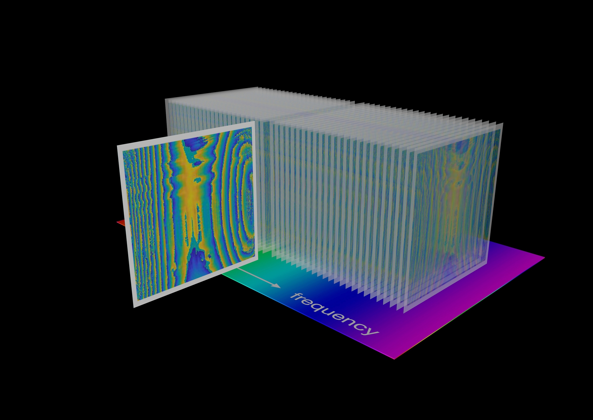 Ein Computer berechnet das Modulationsspektrum des Interferenzsignals für jedes Pixel. Diese Spektren werden in einem Stapel digitaler Hologramme kombiniert (Abbildung), ein Amplituden- und ein Phasenhologramm für jede Kammlinie.