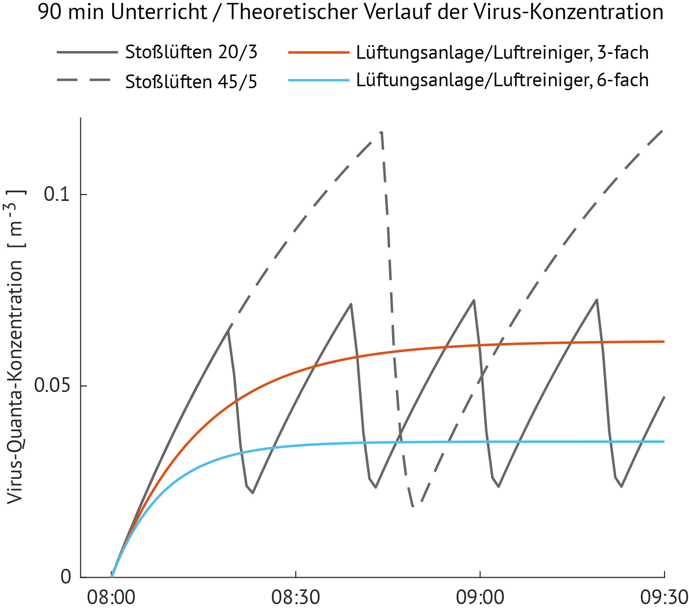 Das Liniendiagramm (Abbildung 2) zeigt den theoretischen Verlauf der Virus-Konzentration während einer Unterrichtszeit von 90 Minuten für vier verschiedene Lüftungsszenarien. Für die Berechnung wurde angenommen, dass eine Schülerin oder ein Schüler infektiös ist. Wird das Klassenzimmer, wie vom UBA empfohlen, alle 20 Minuten gelüftet, so ergibt sich eine deutlich niedrigere Virus-Konzentration, als wenn lediglich nach jeder Unterrichtsstunde, also alle 45 Minuten, gelüftet wird. Mit Lüftungsanlagen oder mobilen Luftreinigern kann die Virus-Konzentration dauerhaft auf einem niedrigen Niveau gehalten werden, wenn das 3- bis 6-fache des Raumvolumens pro Stunde gegen Frischluft ausgetauscht bzw. gereinigt wird.