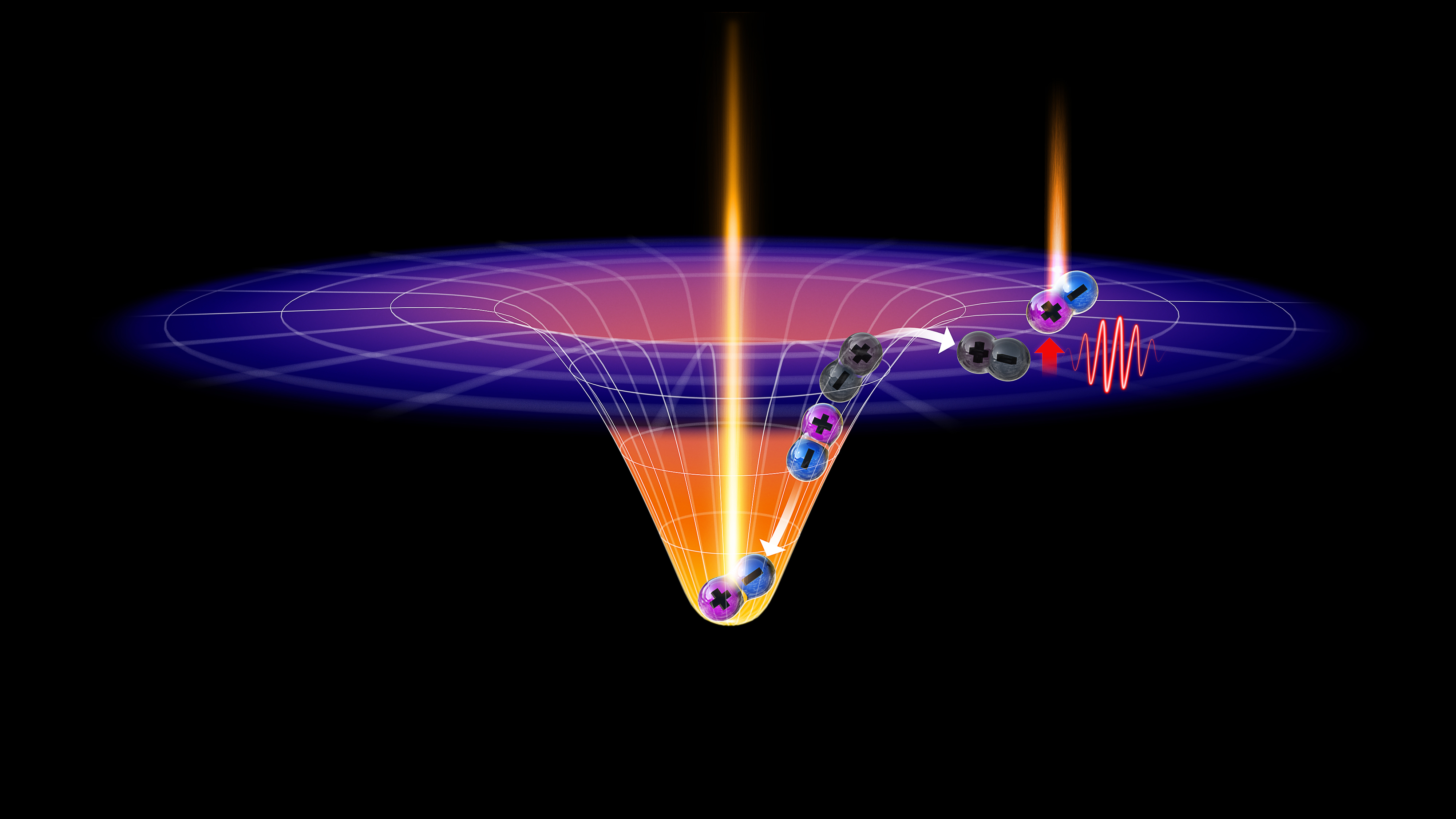 „In ultradünnen TMDs können negative und positive Ladungen erzeugt werden, die in einem stark gebundenen Zustand vorliegen – als Paar aus Elektron und Leerstelle“, sagt Physikprofessor Dr. Rudolf Bratschitsch von der Westfälischen Wilhelms-Universität Münster, der für die experimentellen Beiträge verantwortlich war. Fachleute bezeichnen ein solches gebundenes Elektron-Loch-Paar als Exziton. „Wenn Exzitonen zerfallen, emittieren sie ein Photon“, führt Bratschitsch aus: Die atomar dünne Schicht leuchtet. Es gibt aber auch Elektron-Loch-Paare, die nicht zu Licht werden, also nicht sichtbar sind; daher nennt man sie dunkle Exzitonen. „Obwohl man dunkle Exzitonen nicht sehen kann, beeinflussen sie die Lichtemission von Halbleitern“, legt Malic dar.