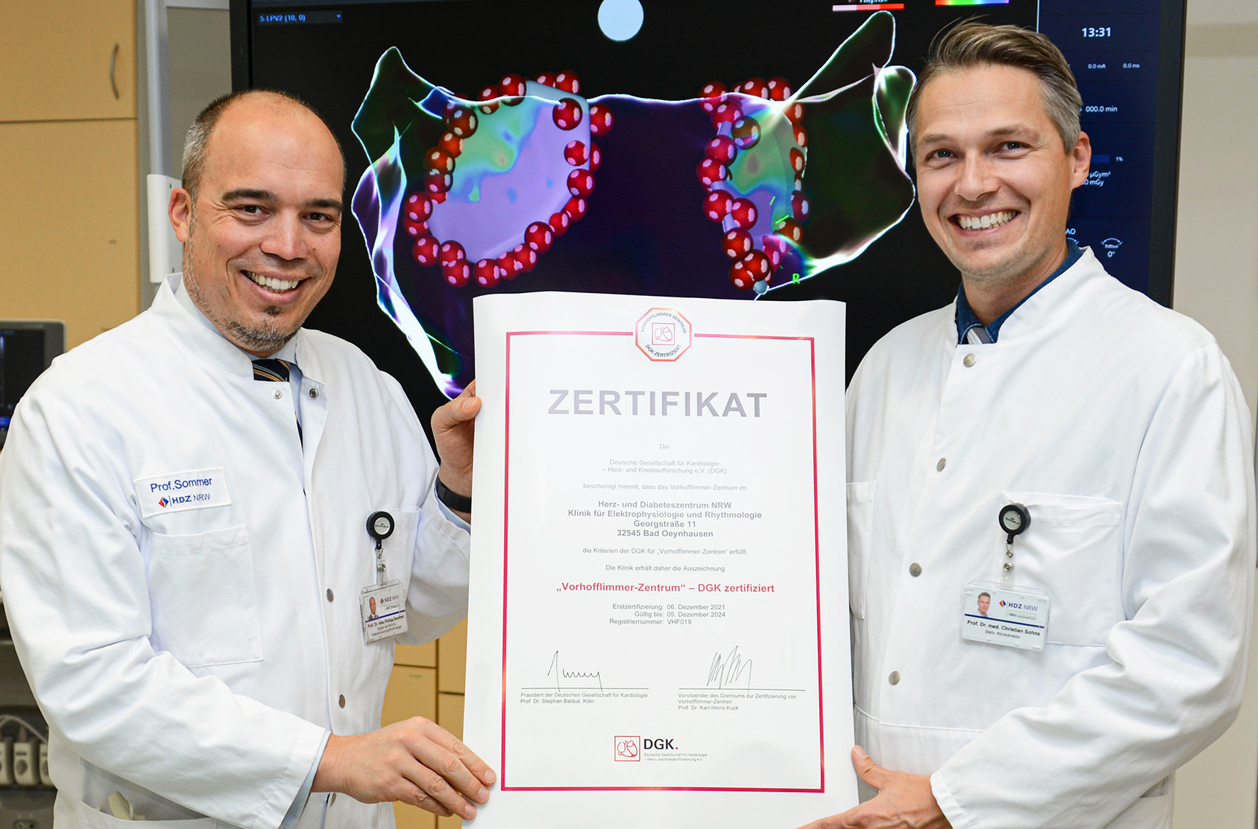 Als ausgewiesenes Zentrum zur Behandlung von Vorhofflimmern hat die Klinik für Elektrophysiologie/Rhythmologie unter der Leitung von Klinikdirektor Prof. Dr. Philipp Sommer und dem Leitenden Oberarzt Prof. Dr. Christian Sohns (stellv. Klinikdirektor) das Zertifizierungsverfahren der Deutschen Gesellschaft für Kardiologie mit Bravour bestanden. Die Gutachter bescheinigten den HDZ-Spezialisten beeindruckende Leistungen hinsichtlich der in den Vorgaben der Fachgesellschaft festgelegten personellen, technischen, strukturellen und organisatorischen Anforderungen, die eine dauerhaft gute Behandlungsqualität mit hoher Erfolgs- und geringer Komplikationsrate sicherstellen. Zweifelsfrei zähle das HDZ NRW damit zu den führenden elektrophysiologischen Zentren in Deutschland, lautete das Lob der prüfenden Fachgesellschaft.