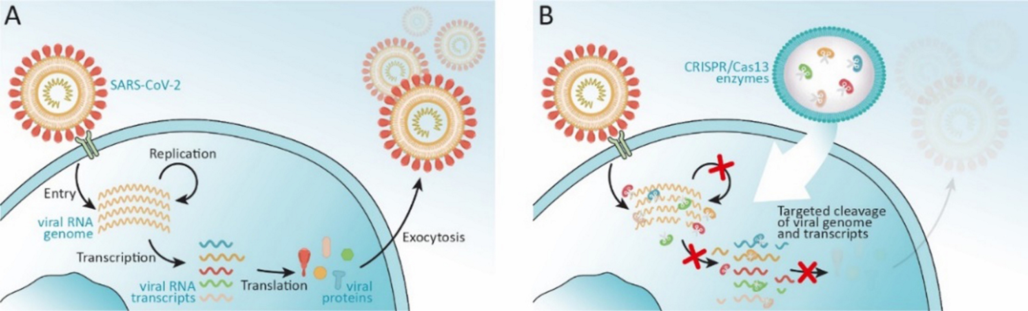 Abbildung 1. A. Das SARS-CoV-2 Genom wird in die Zelle abgegeben. Dort wird das virale Genom vermehrt und die Transkripte in Proteine übersetzt, um weitere Kopien von SARS-CoV-2 zu bilden. B. CRISPR/Cas13-Enzyme werden durch Genfähren (AAV-2) in die Zelle eingebracht und „zerschneiden” dort gezielt verschiedene Stellen des viralen SARS-CoV-2 Genoms und seiner Transkripte mittels einer spezifischen Kombination an crRNAs. Dadurch wird die Vermehrung von SARS-CoV-2 verhindert und Transkripte, die sonst in toxische Proteine übersetzt werden, reduziert.