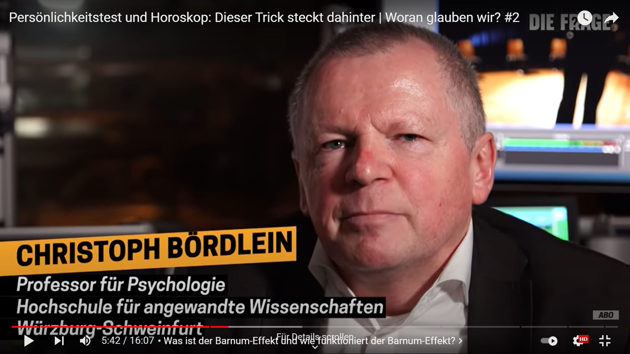 Angewendet wurde in dem Experiment der sogenannte „Barnum-Effekt“, abgeleitet vom Zirkusgründer Phineas Taylor Barnum, der in seiner Manege für jeden etwas im Programm dabeihatte. Der „Barnum-Effekt“ bezeichnet die Neigung von Menschen, unspezifische allgemeingültige Aussagen über sich selbst so zu interpretieren, dass sie als zutreffende Beschreibung empfunden werden könnten. Dr. Christoph Bördlein, Professor an der Hochschule für angewandte Wissenschaften Würzburg-Schweinfurt und Mitglied der Gesellschaft zur wissenschaftlichen Untersuchung von Parawissenschaften (GWUP, https://www.gwup.org/), begleitete das Projekt.