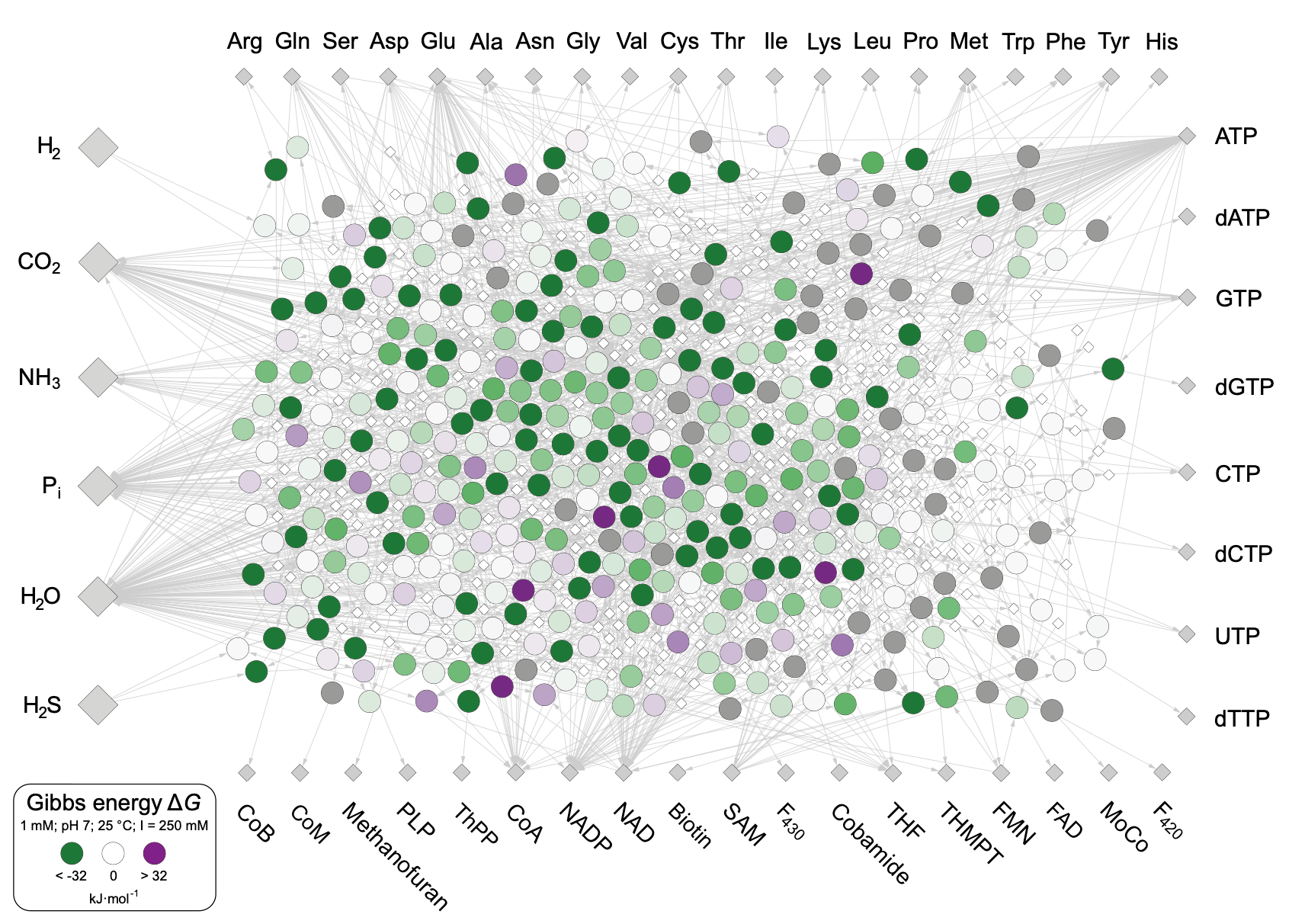 The Metabolism of LUCA. The research team investigated 402 biochemical reactions that are required for the biosynthesis of the molecular building blocks of life. Each circle represents one reaction, its color represents the energy that is released at each reaction. Green means energy is released, violet means energy is required.