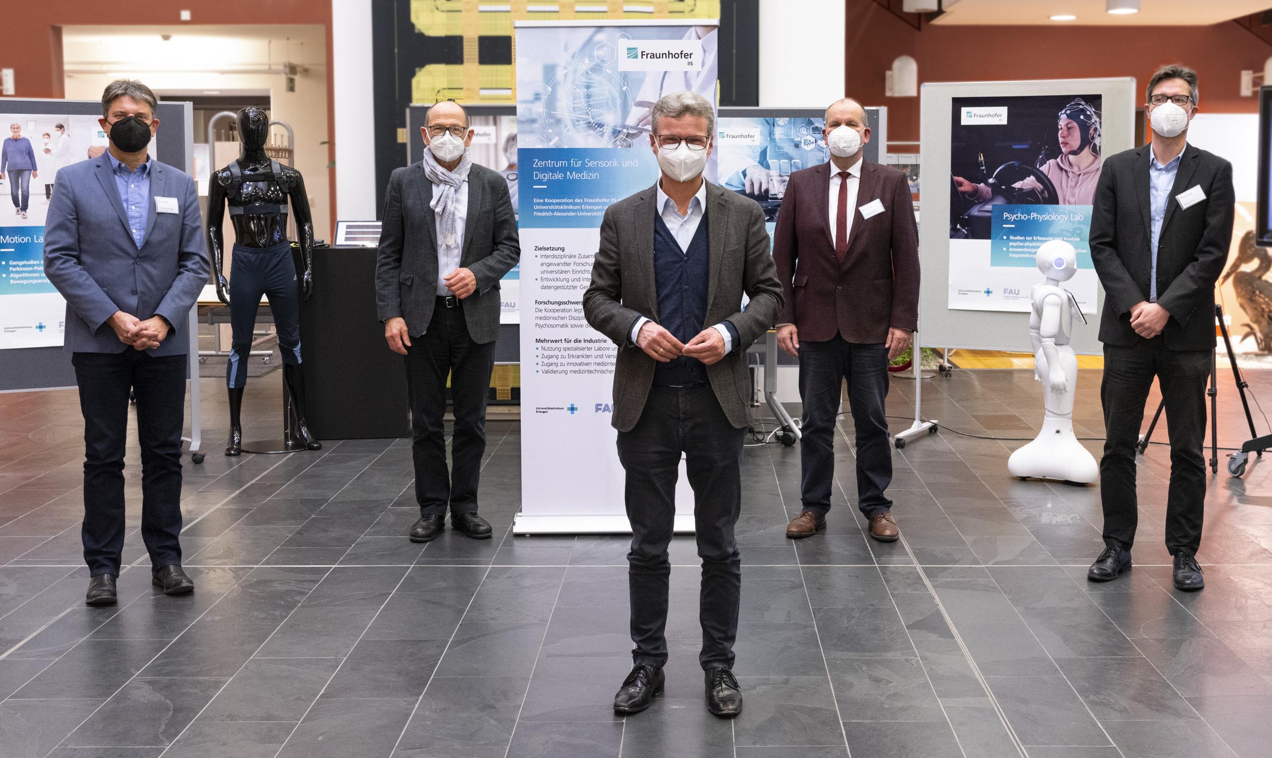 Pressebild: V.l.n.r.: Prof. Dr. Joachim Hornegger, Prof. Dr. Albert Heuberger, Staatsminister Bernd Sibler, Prof. Dr. Jürgen Winkler, Matthias Struck