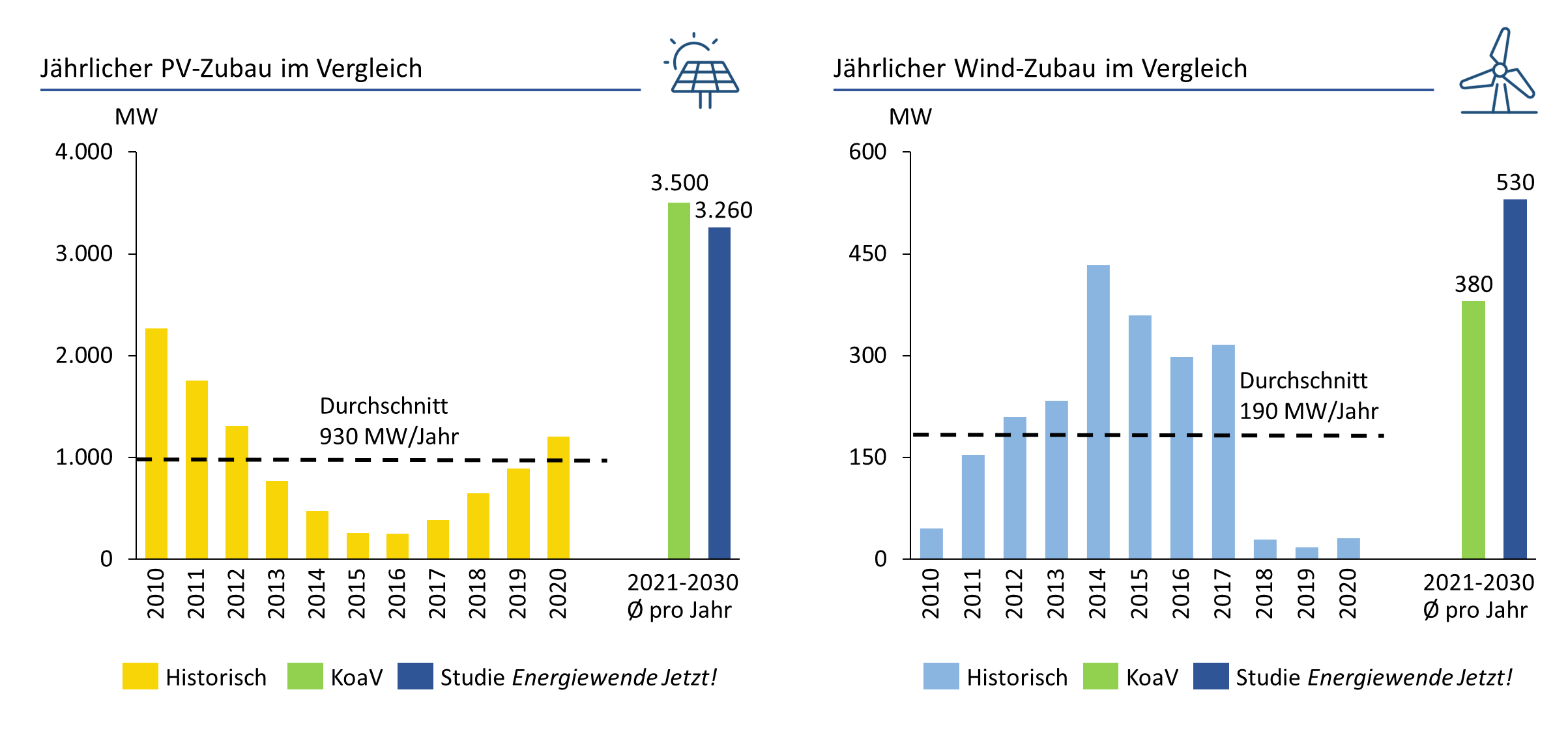 Diese Ziele liegen heruntergebrochen für Bayern nah am Ausbaupfad der Kurzstudie Energiewende Jetzt!, in der untersucht wird, wie der Freistaat bis 2040 klimaneutral werden kann. Abbildung 1 ordnet die Ziele des Koalitionsvertrags in den historischen Ausbaupfad für Bayern ein und vergleicht sie mit den Werten der Kurzstudie. Der historische Zubau der erneuerbaren Energien im zurückliegenden Jahrzehnt liegt in Bayern bei PV im Durchschnitt bei 930 MW und bei Windkraft bei 190 MW pro Jahr.