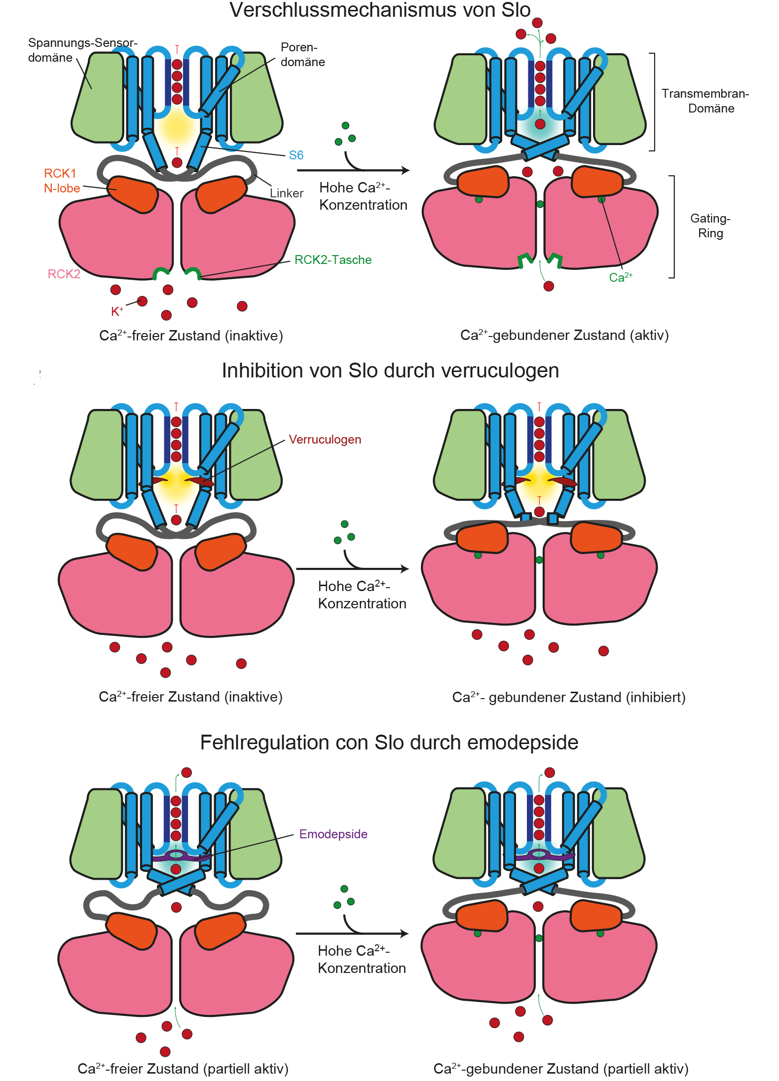 Darüber hinaus haben die Forscher auch die Kryo-EM-Strukturen des Kanals mit zwei bekannten Verbindungen, Verruculogen und Emodepsid, gelöst. Das kleine Molekül Verruculogen ist ein Nervengift bestimmter Pilze, das perfekt in die S6-Tasche in der Nähe des zentralen Hohlraums passt. Verruculogen hält den Kanal eng und verschlossen. Emodepsid, ein Medikament gegen Darmparasiten bei Katzen und Hunden, bindet ebenfalls in der Nähe der S6-Tasche. Es wirkt jedoch anders, nämlich wie ein zusätzlicher Filter, der es dem Kalium erschwert, den Kanal optimal zu durchqueren. "Es ist wichtig zu verstehen, wie diese Liganden den Kanal manipulieren können", sagt Raunser.