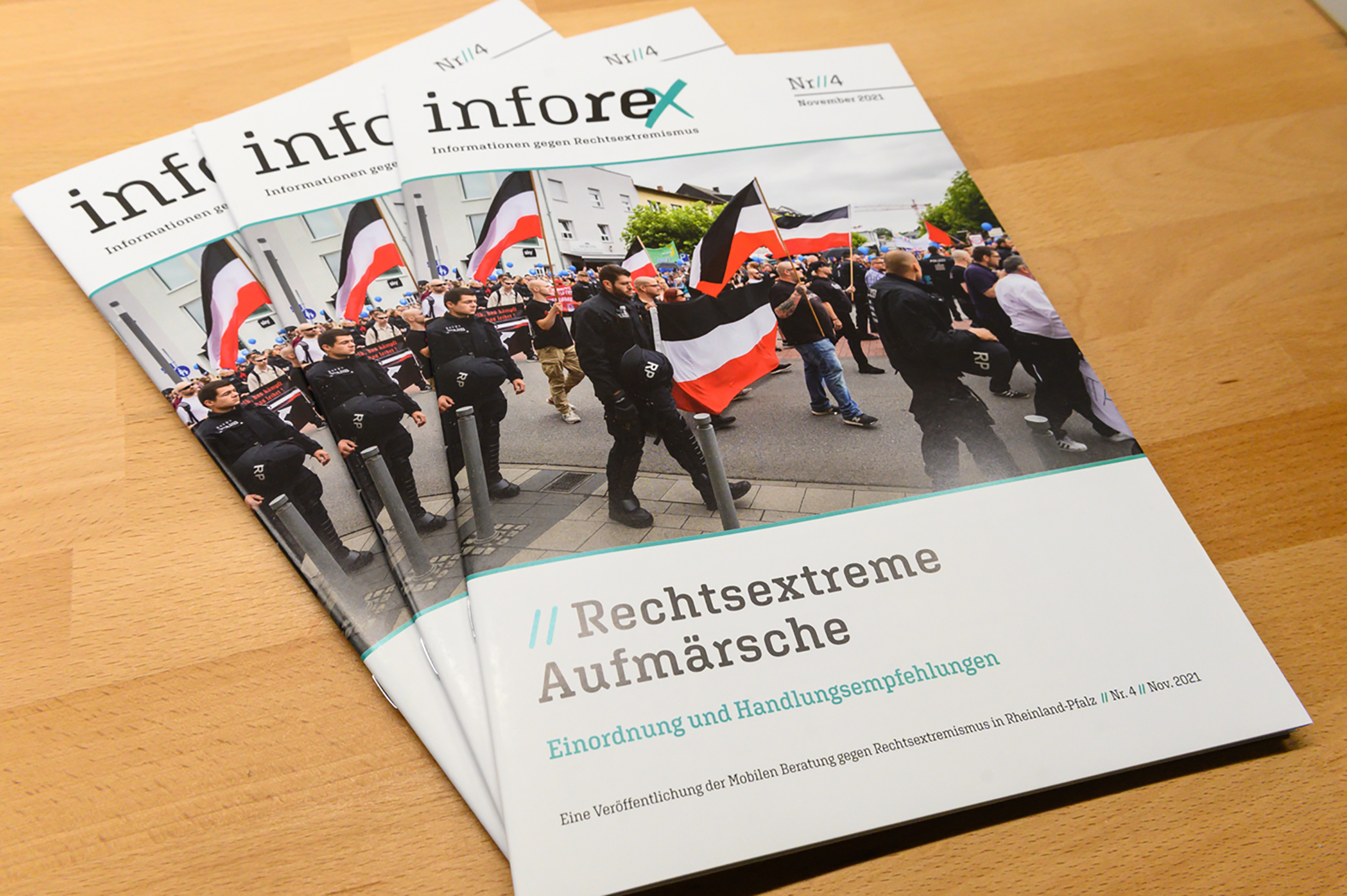 Die Mobile Beratung gegen Rechtsextremismus (MBR) Rheinland-Pfalz hat neun Regionalstellen unter zivilgesellschaftlicher Trägerschaft – eine davon in der Hochschule Koblenz im Büro für Gleichstellung und Diversity, zuständig für die Stadt Koblenz, die Stadt Neuwied sowie die Landkreise Neuwied, Mayen-Koblenz und Ahrweiler. Zu den Aktivitäten der MBR Rheinland-Pfalz gehört die Herausgabe des Magazins „Informationen gegen Rechtsextremismus“ (inforex), das sich in unregelmäßigen Abständen jeweils mit einem bestimmten Aspekt von Rechtsextremismus näher befasst. Die aktuelle Ausgabe 04/2021 beleuchtet das Thema „Rechtsextremistische Aufmärsche – Einordnung und Handlungsempfehlungen“.