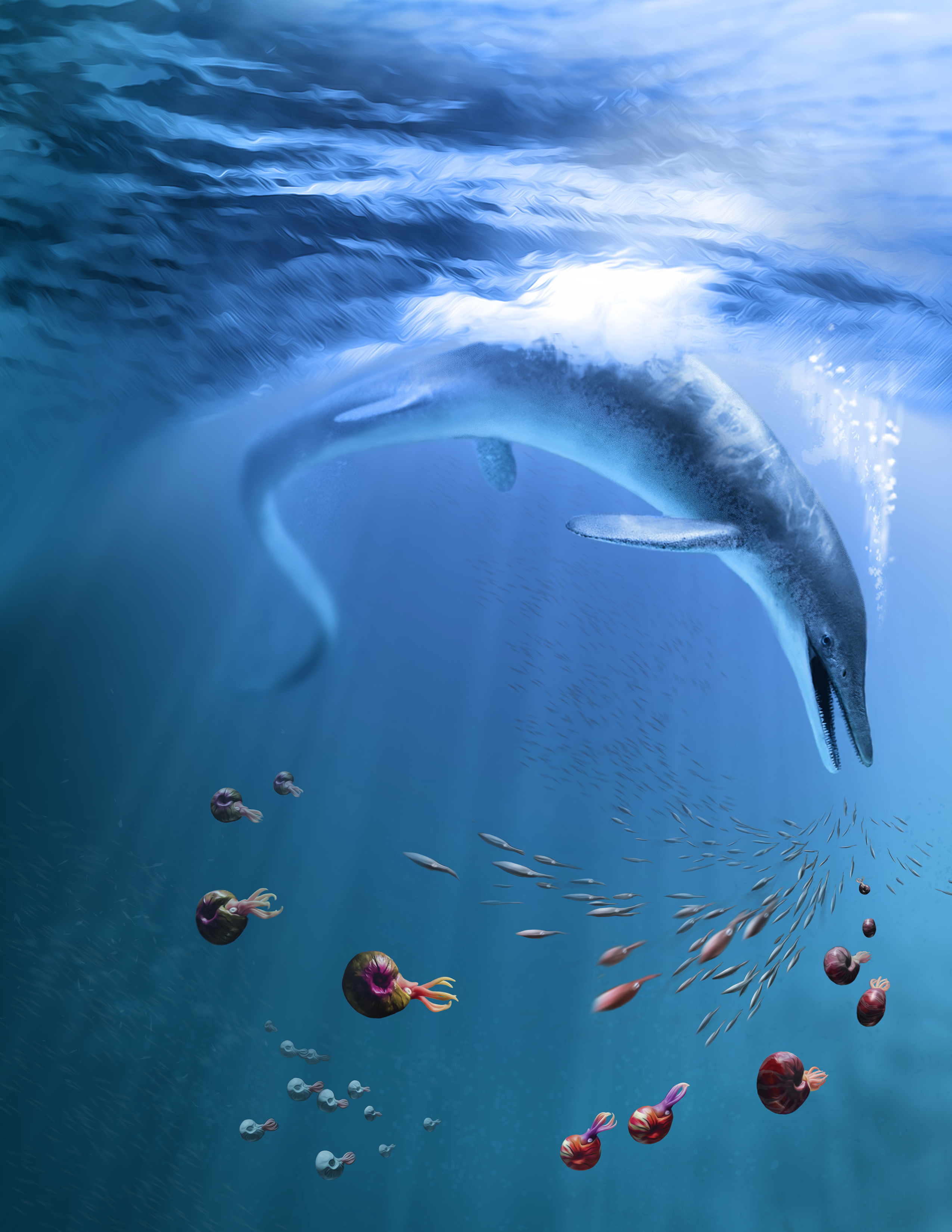 Die Forschenden fanden heraus, dass sich zwar sowohl Wale als auch Ichthyosaurier zu Riesentieren entwickelten, dass aber diese Entwicklung in beiden Gruppen unterschiedlich verlaufen ist. Laut Schmitz „zeigen die Evolutionsmodelle sehr deutlich dass die Ichthyosaurier einen anfänglichen Größenboom hatten und schon früh in ihrer Evolutionsgeschichte zu Giganten wurden, während Wale viel länger brauchten, um ihre maximale Größe zu erreichen.“ Der Grund: Ichthyosaurier scheinen von einem Überfluss an aalähnlichen Conodonten sowie einer Vielzahl von Ammoniten profitiert zu haben – schalentragende Verwandte der modernen Tintenfische, insbesondere des Nautilus. Die heute ausgestorbenen Ammoniten füllten die ökologische Lücke nach dem Massenaussterben am Ende des Perms und fanden hervorragende Lebensbedingungen vor. „Wir nehmen an, dass sich die Ichthyosaurier auch derart rasant entwickeln konnten, weil sie als erste größere Lebewesen die Weltmeere bevölkerten und einem geringeren Konkurrenzkampf ausgesetzt waren“, sagt Martin Sander.