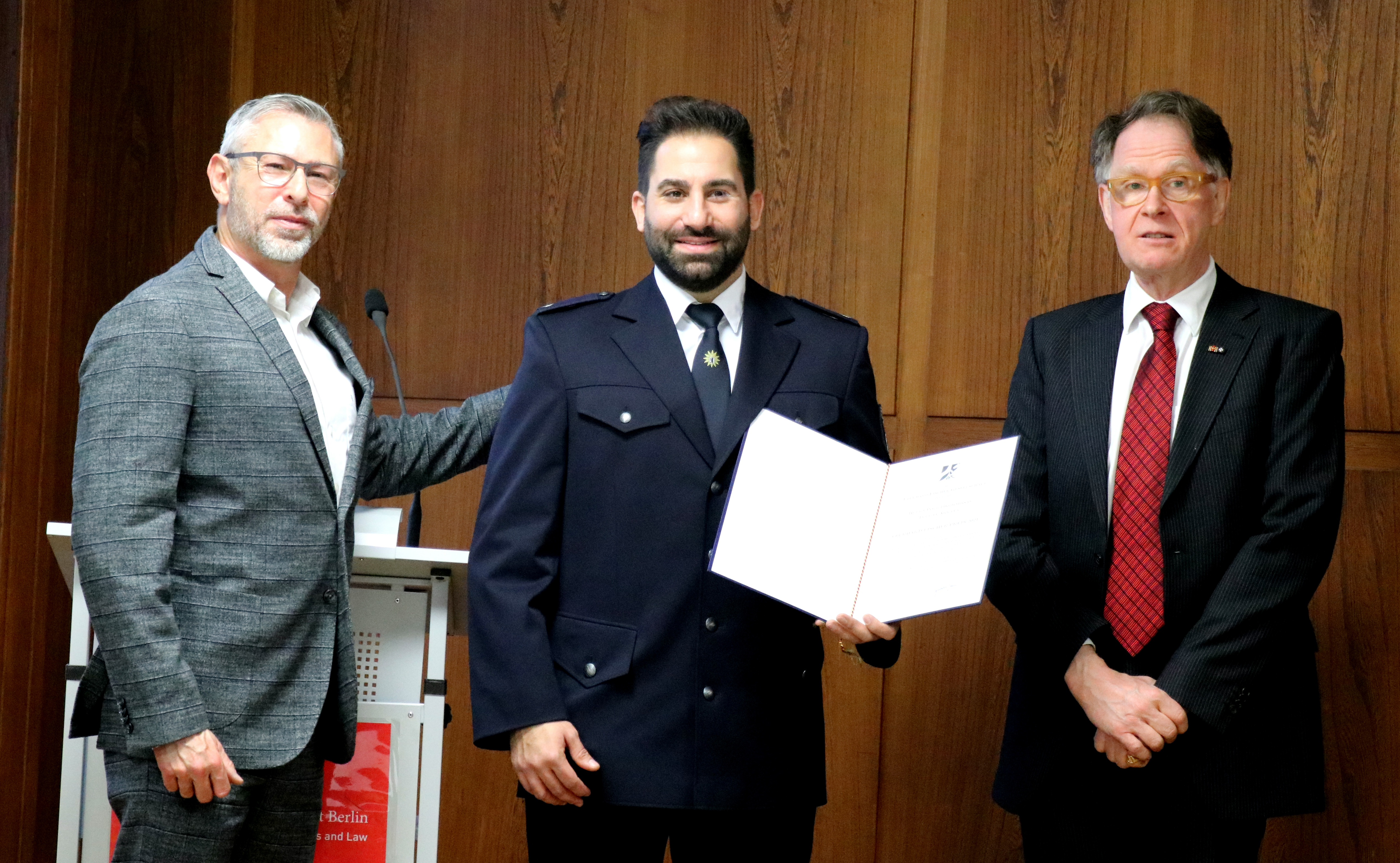 Für die Erarbeitung der speziellen Checkliste, die in Form einer App bedient werden soll, stellte Turgay Akkaya im Rahmen einer empirischen Projektstudie und unter Anleitung von Christian Matzdorf, Professor für Kriminalistik am Fachbereich Polizei und Sicherheitsmanagement der HWR Berlin, gemeinsam mit Mitarbeiter*innen von Fachdienststellen der Berliner Polizei eine Risikoanalyse auf. Mittels einer quantitativen Online-Umfrage untersuchte Akkaya dann, in welchem Ausmaß die Checkliste sinnvoll für die Polizeipraxis ist und welche Einsatzmöglichkeiten sich bieten. „Damit geben Sie Polizei- und Ermittlungsbehörden ein wichtiges Werkzeug für zukünftiges Vorgehen an die Hand“, hebt der ehrenamtliche Richter am Landgericht Berlin Stefan Graf Finck von Finckenstein in seiner Laudatio hervor. Der Wissenschaftshistoriker und Publizist hat die Abschlussarbeit gemeinsam mit Erstgutachter Prof. Christian Matzdorf betreut.