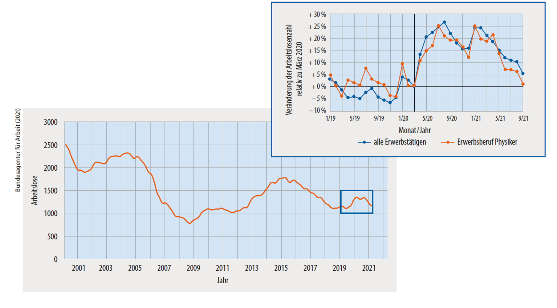 Bad Honnef, 11. Januar 2022 – Trotz der Coronakrise ist die Arbeitsmarktsituation für Physikerinnen oder Physiker gut: Beginnend im März 2020 zeichnete sich pandemiebedingt zwar zunächst ein leichter Anstieg bei der Zahl der Arbeitslosen ab, der seit März 2021 aber wieder abklingt. Inzwischen ist wieder das Niveau von vor der Covid-19-Pandemie erreicht.