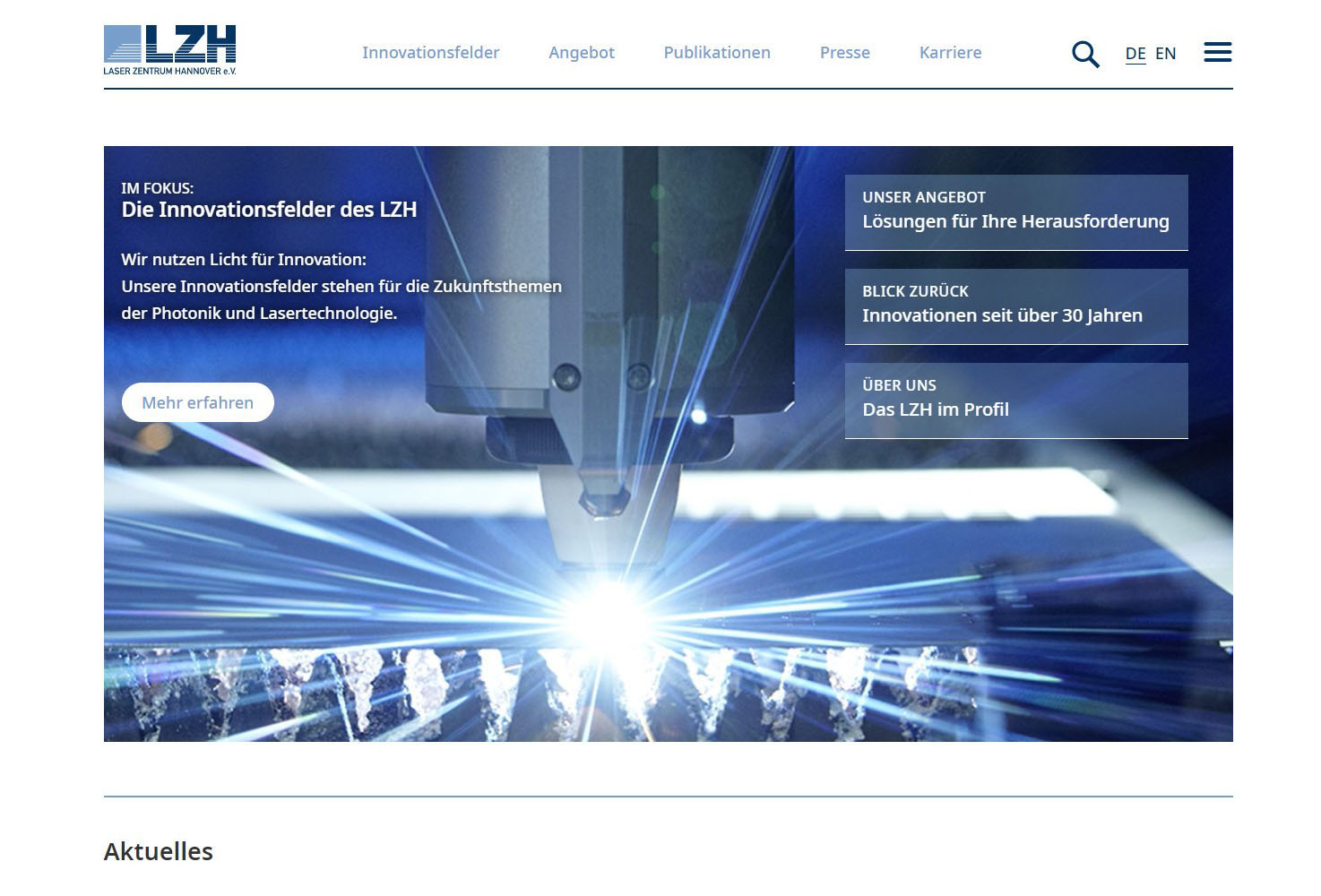 Smarte Photonik ist zukunftsweisend, digital, intelligent. Das Laser Zentrum Hannover e.V. (LZH) bündelt ab sofort in acht Innovationsfeldern die Themen der Zukunft in den Bereichen Photonik und Lasertechnologie. Die vollständig überarbeitete Webseite www.lzh.de des unabhängigen Forschungsinstituts lädt ab sofort ein die Themen näher zu erkunden.