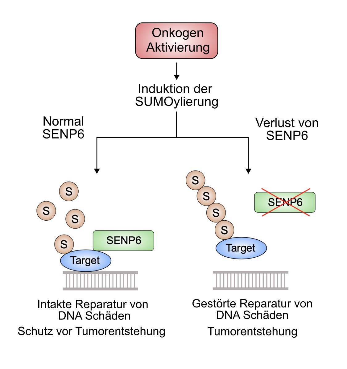 Welche Rolle das Gen bei Krebserkrankungen spielt, war bisher nicht bekannt. Das dadurch kodierte Protein SENP6 entfernt die SUMO-Modifikationen von anderen Proteinen der Zelle und steuert somit auch deren Wechselwirkungen untereinander. Das Forschungsteam konnte nun belegen, dass das gezielte Ausschalten von SENP6 zur Krebsentstehung führt, es sich also um ein Tumorsuppressorgen handelt. In gesunden Zellen hat SENP6 eine zentrale Rolle bei der Reparatur von DNA-Schäden. Nach Verlust des Gens wird diese Funktion beeinträchtigt, und somit häufen sich im Erbgut Schäden an, die letztlich zur Entstehung von Krebs beitragen. Die Tumorbildung nach Verlust von SENP6 ließ sich allerdings effektiv unterdrücken durch Hemmung des DNA-Reparaturenzyms PARP mithilfe von Medikamenten, die bereits für die Brustkrebstherapie zugelassen sind. Prof. Dr. Stefan Müller, dessen Arbeitsgruppe am Institut für Biochemie II der Goethe-Universität an der funktionellen Charakterisierung des SENP6-Proteins beteiligt war, macht deutlich: „Ein Schlüssel für den Erfolg des Projekts ist die Kombination der biochemischen Expertise in Frankfurt und der klinischen Expertise an der Charité in Berlin."