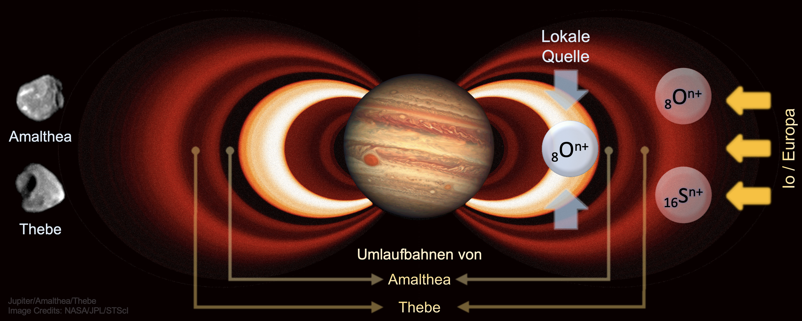 Weiter innen, innerhalb der Umlaufbahn von Amalthea, ändert sich die Ionen-Zusammensetzung dramatisch zu Gunsten von Sauerstoff. „Die Konzentration und die Energie der Sauerstoff-Ionen ist dort deutlich höher als erwartet“, so Roussos. Dabei müsste die Ionen-Konzentration in diesem Bereich eigentlich abnehmen. Denn die Monde Amalthea und Thebe absorbieren von außen eindringende Ionen; ihre Umlaufbahnen bilden somit eine Art natürliche Ionen-Barriere. Dieses Phänomen ist aus den Strahlungsgürteln des Saturnsystems mit seinen vielen Monden bekannt.