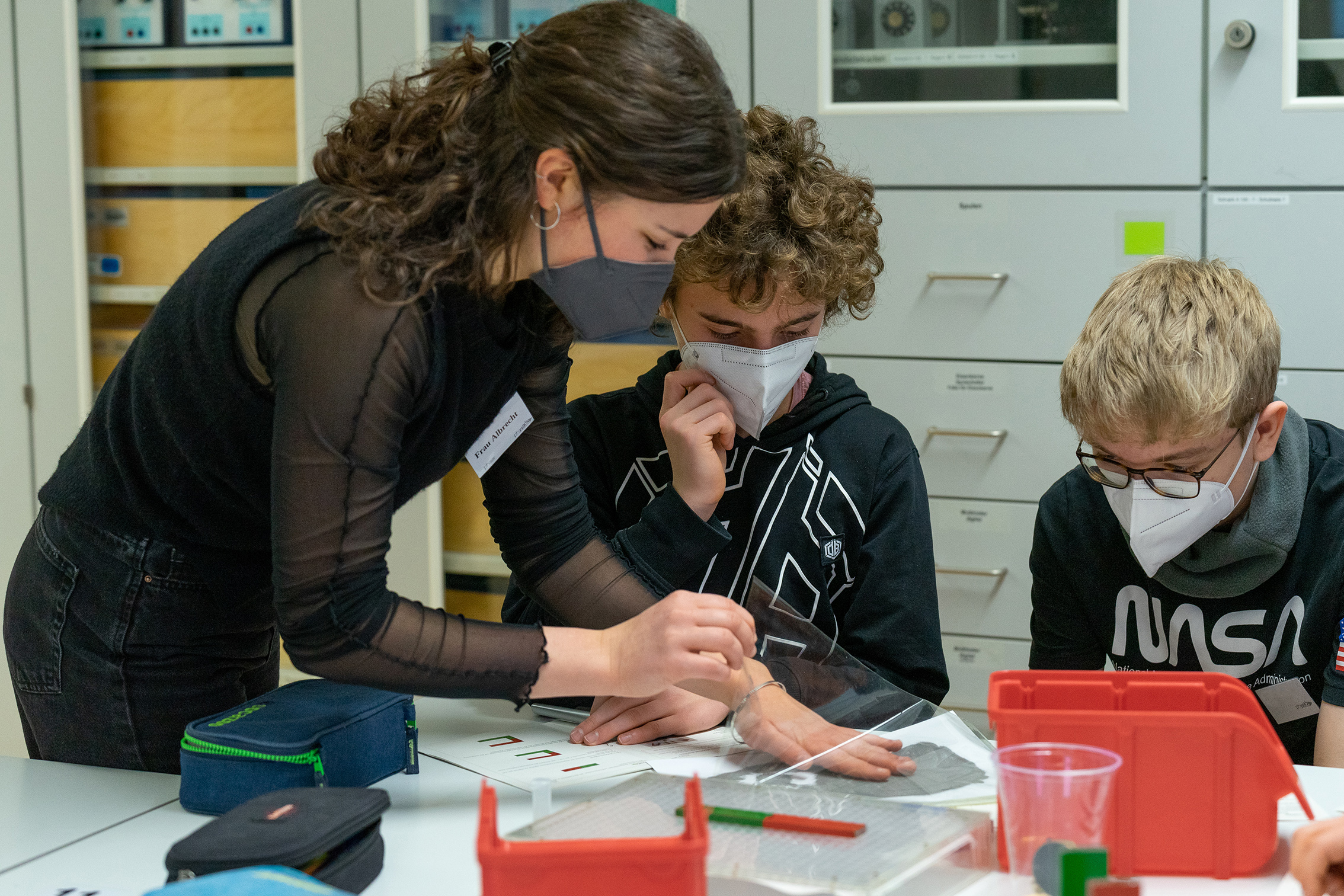 „Das Programm und die Stationenarbeit samt Aufgabenheft und Quiz haben wir Studierenden entwickelt“, berichtet Jule Albrecht, die am KIT Lehramt Gymnasium studiert. Während des Workshops betreut immer ein Student oder eine Studentin eine Schülergruppe und steht für Fragen zur Verfügung. „Am Anfang haben wir außerdem eine Sicherheitseinweisung durchgeführt und den Schülerinnen und Schülern das Material erklärt“, informiert Albrecht.