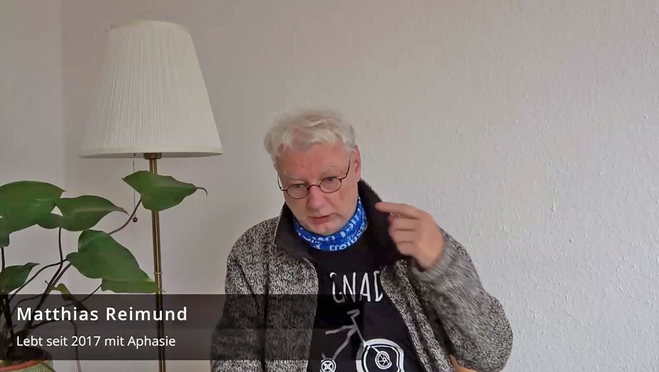 Die zweite studentische Gruppe realisierte einen Videopodcast „Der Aphasie eine Stimme geben“, der während dem „Aphasie 4.2“-Online-Kongress vom 25. bis 27. März 2022 gezeigt wird. Aus drei Perspektiven heraus – der des Aphasikers Matthias Reimund, der Angehörigen Beate Steffens sowie des Leiters der Berufsfachschule für Logopädie Würzburg, des Diplom-Logopäden Markus Heinzl Mania. In zwanzig Minuten erläuterten die Interviewten, welche Auswirkungen die Aphasie haben kann, welche Therapien zum Einsatz kommen, welche positiven Effekte die Sprachbeeinträchtigung haben kann. Matthias Reimund hat für sich herausgefunden: „Die Langsamkeit tut gut.“ Der Link zu dem Video ist ab Kongressbeginn auf der Seite des Kongresses eingestellt (Aphasie Unterfranken).