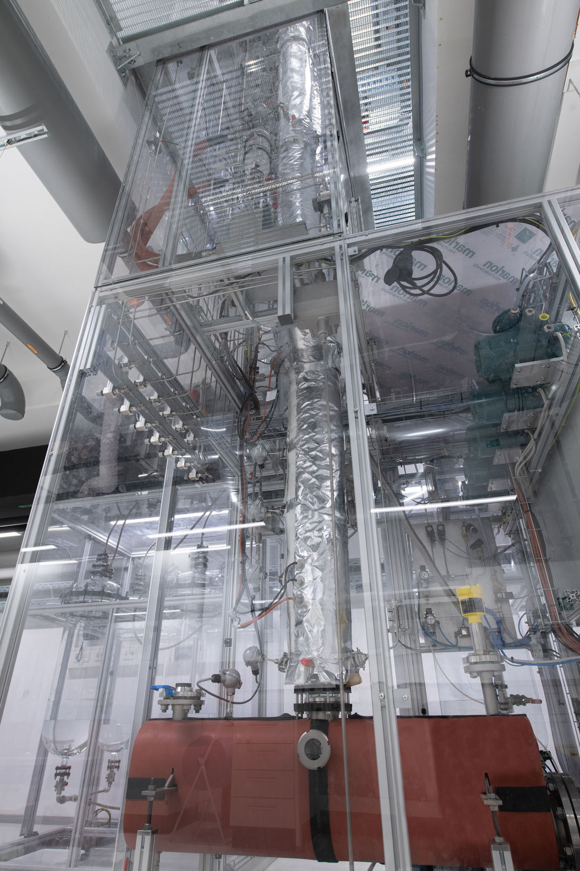 Vor anderthalb Jahren konnten die Chemieingenieurinnen und -ingenieure den Bau der weltweit ersten Multiplen Trennwandkolonne in Auftrag geben – wozu nur wenige europäische Anbieter in der Lage waren. Zeitgleich musste das neue Technikum an der Universität Ulm fertig gestellt werden: In einer explosionsgeschützten Umgebung konnte die Destillationsanlage der Superlative im September 2021 in den Testbetrieb gehen. Das Großgerät mit einer Heizleistung von 10 kW verfügt über 70 verbaute Sensoren. Der Druck innerhalb der Anlage kann bis zum Vakuum eingestellt werden – je nachdem welches Gemisch getrennt werden soll.