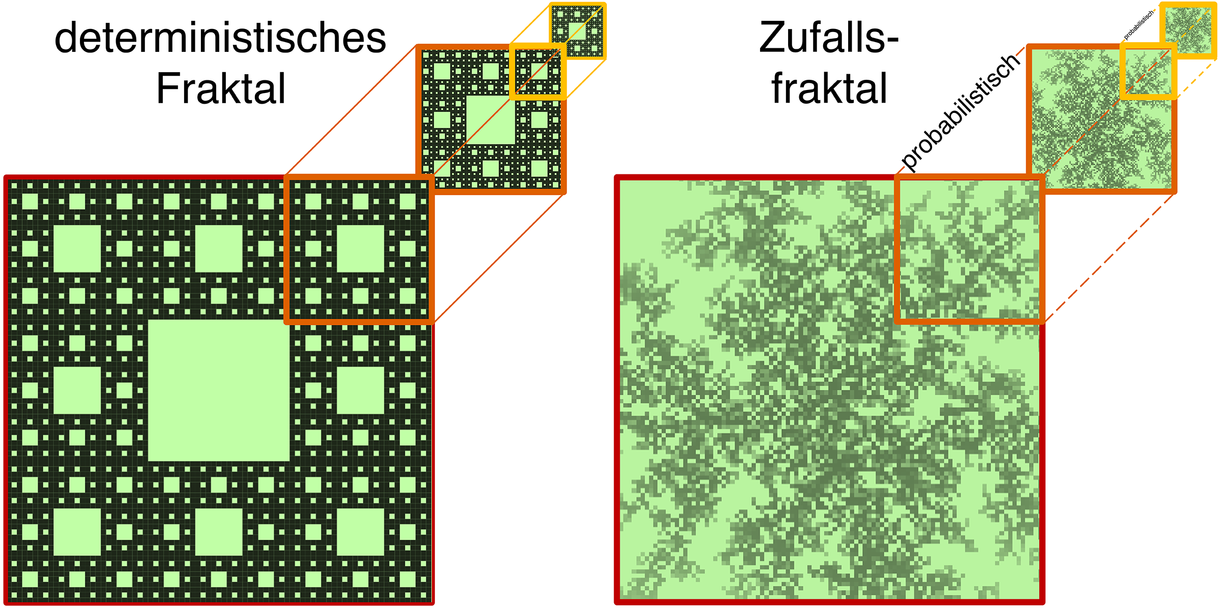 Fraktale sind idealisierte geometrische Objekte, die auf allen Längenskalen gleich aussehen: Ein Ausschnitt eines Fraktals ähnelt also einem kleineren Ausschnitt ebenso wie einem noch kleineren Ausschnitt – dies wird auch „Selbstähnlichkeit“ genannt. Es wird zwischen zwei Arten unterschieden: den „deterministischen Fraktalen“, die auf allen Längenskalen identisch sind, ein Beispiel hierfür sind Eiskristalle; und den „Zufallsfraktalen“, wo die Ähnlichkeit statistisch ist. In der Natur findet man diese beispielsweise beim Blumenkohl, bei Farnen und Blutgefäßen. Diese realen Strukturen decken jedoch nur eine endliche Längenskala ab und sind damit im Gegensatz zu idealen Fraktalen nur über wenige Stufen selbstähnlich.